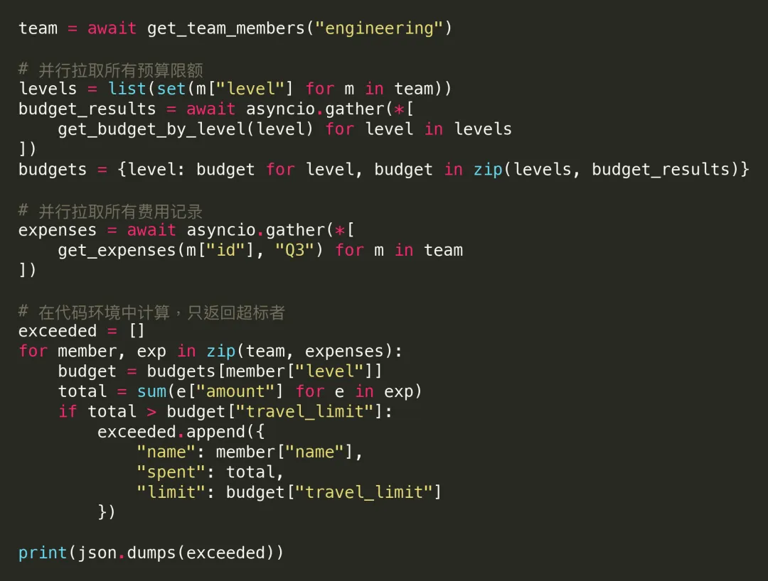 • Claude 只看到最终结果:[{"name": "Alice", "spent": 12500, "limit": 10000}, ...]