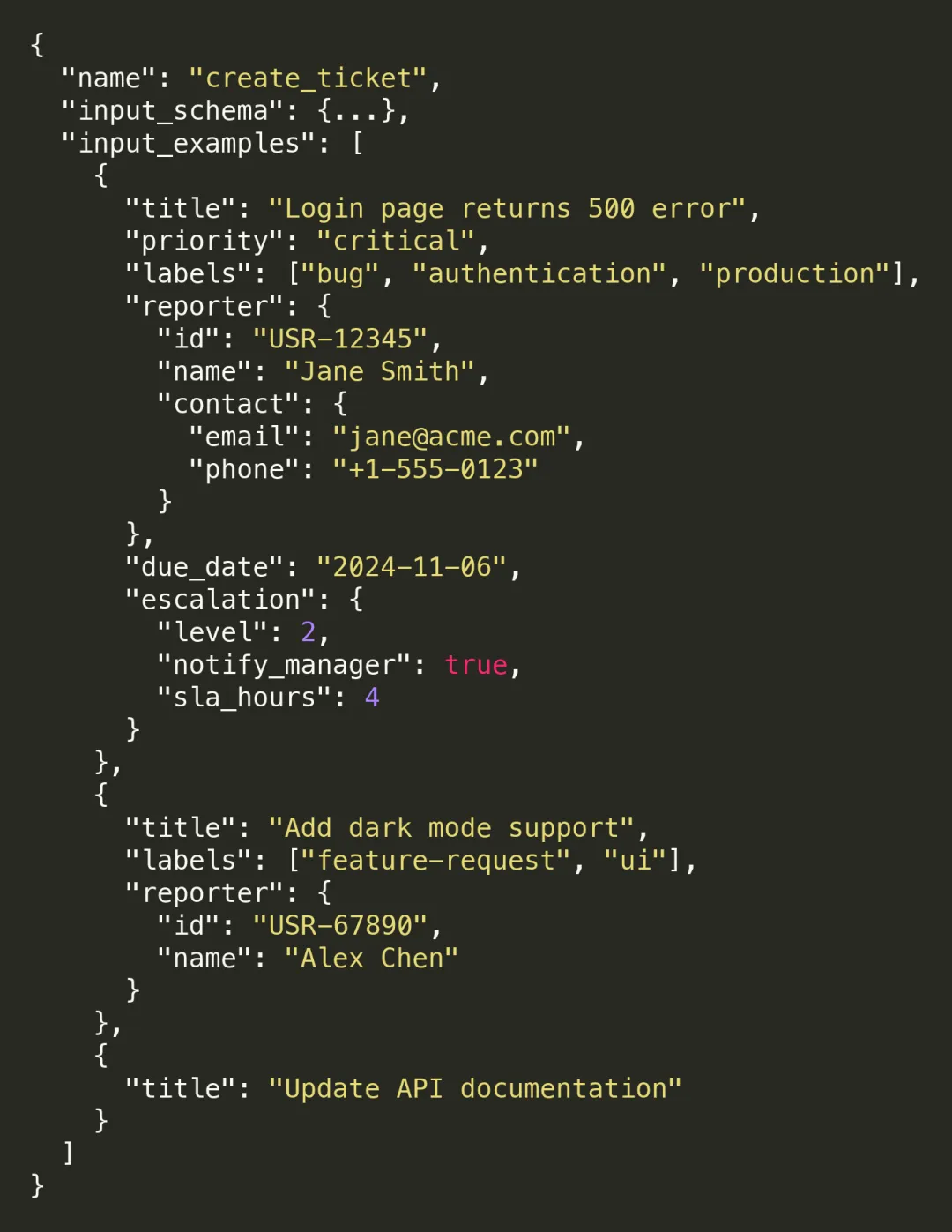 • 嵌套结构规则:如何构造带有嵌套 contact 的 reporter 对象