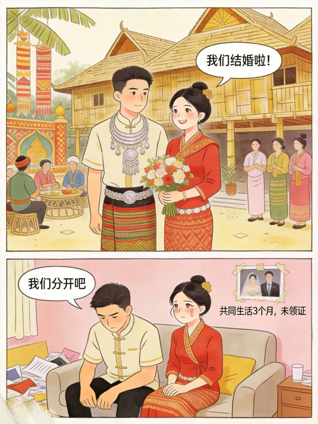 · 案例:傣族小伙岩温和汉族姑娘小刘按风俗办了婚礼,但共同生活3个月就分手,没领证。