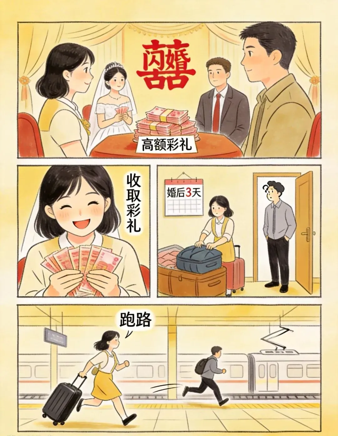· 案例:某女子短期内多次“闪婚”收取高额彩礼,每次婚后不久就跑路。