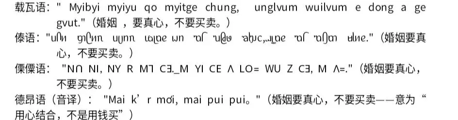 载瓦语:“Paungun gi igvun le dvuwu mu pyit cha lve.”(彩礼要根据家庭的实际情况决定。)