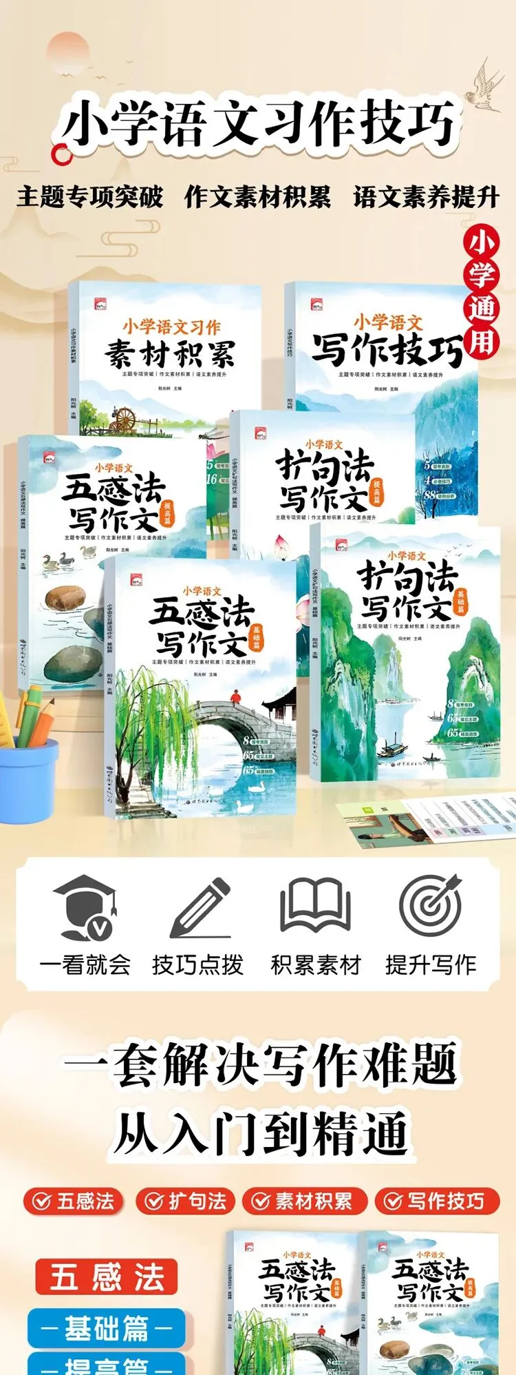 正版🔥小学生作文提分神器!6本一套搞定五感法+扩句法,告别流水账!