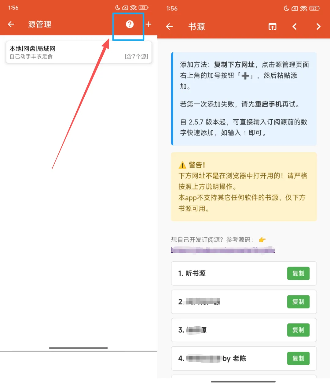 复制自己需要的听书源,返回【源管理】,点击右上角“+”号,粘贴导入即可。