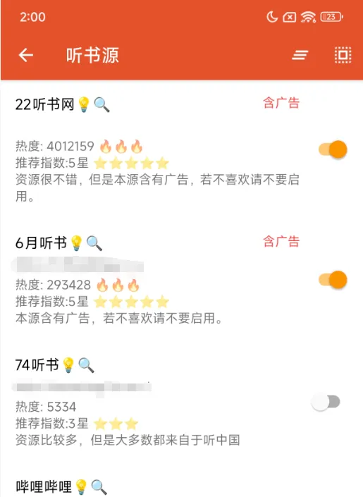 导入成功后,就能看到所有添加的听书源,还能自由控制每个源的开启/关闭。如果遇到某类源的播放页有广告,直接关闭该源,就不会搜索到相关资源,按需选择更灵活~