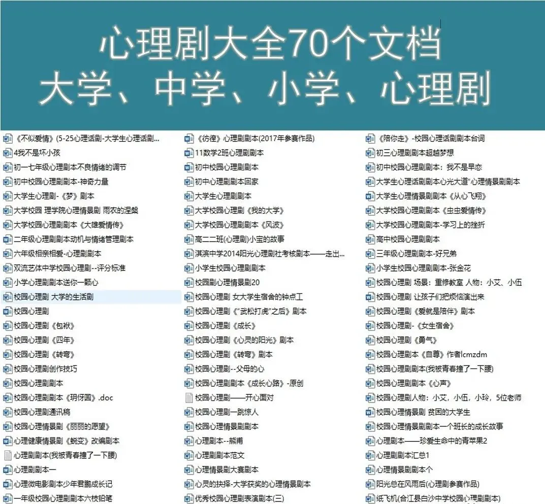 【免费领取】心理剧大全70个文档(包括小学+中学+大学)