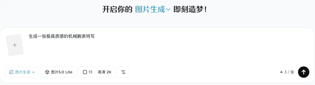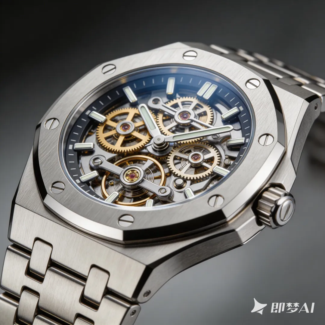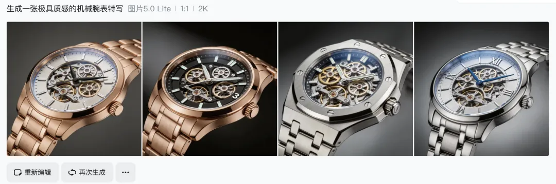 先用即梦生图模型,生成一张极具质感的机械腕表特写作为首帧(锁定构图和产品细节)。
