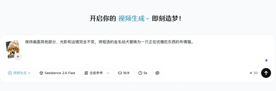 痛点: 跑出了一套极其完美的“一只金毛幼犬在阳光下欢快吃着高级宠物粮”的动态分镜。提案前一小时,客户说:“老 K,咱们这次主推猫粮,能把狗换成猫吗?”