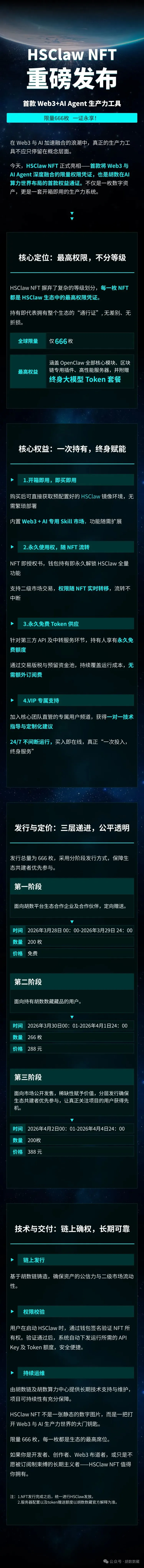 【胡数】在在Web3与AI加速融合的浪潮下,胡数重磅推出HSClaw NFT,这是首款将Web3与AI Agent深度融合的限量权益凭证,也是布局AI算力世界的核心通行证。