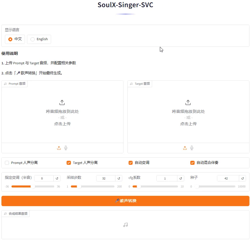 • 输入:Prompt 音频建议是干净清晰的歌声,Target 音频可以是纯歌声或伴奏,这两者若带伴奏需要勾选分离选项 -