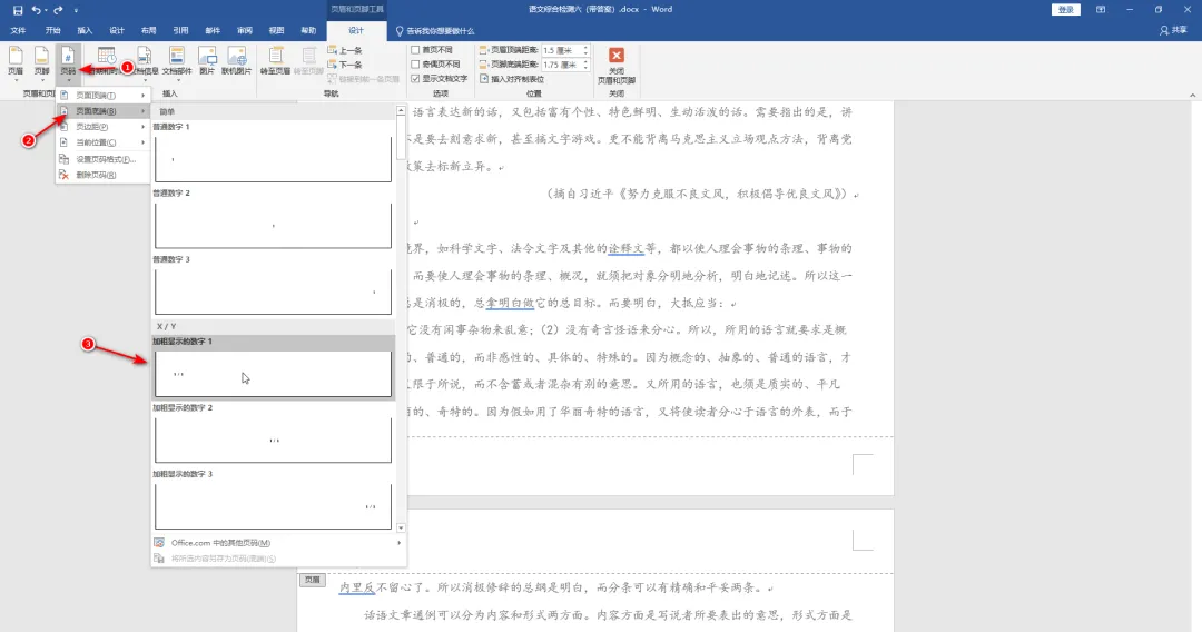 2.3 选择“加粗显示的数字1”,我选择的这个选项带有总页数和当前页码