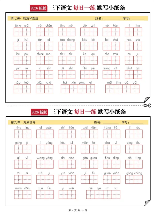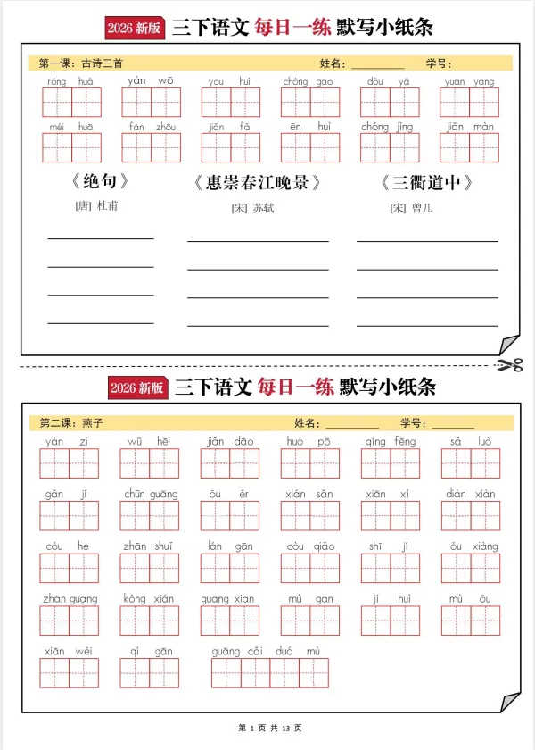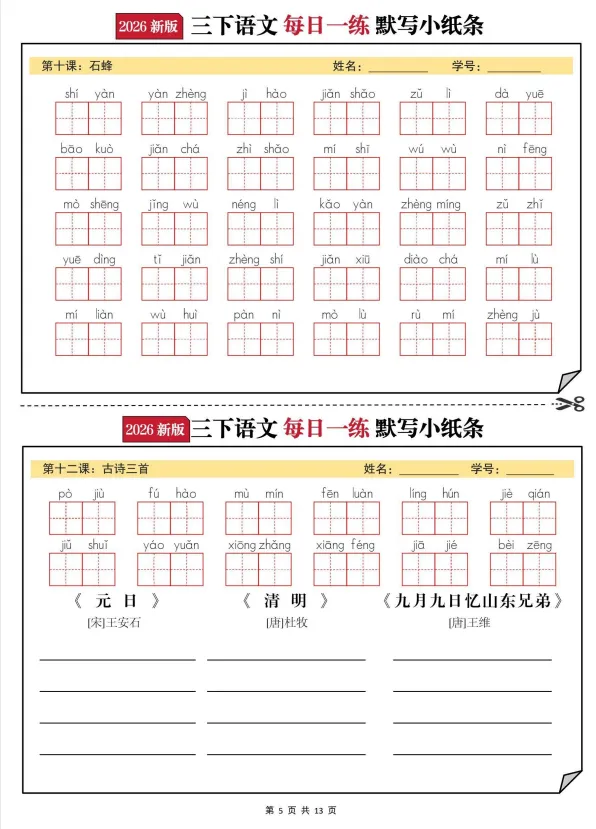 26春语文三年级下册《默写小纸条》,电子版可打印