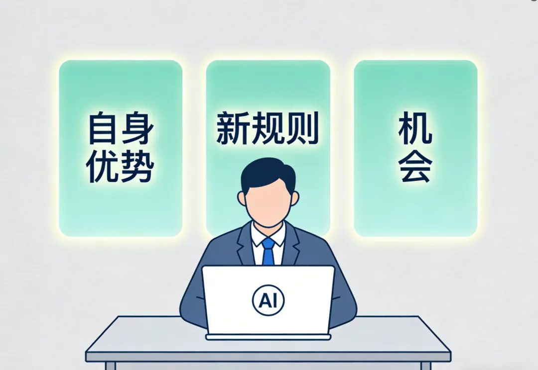 配图建议:简约商务风插画,一个人坐在书桌前,面前是打开的电脑(有 AI 图标),身后是写着 “自身优势”“新规则”“机会” 的发光板块