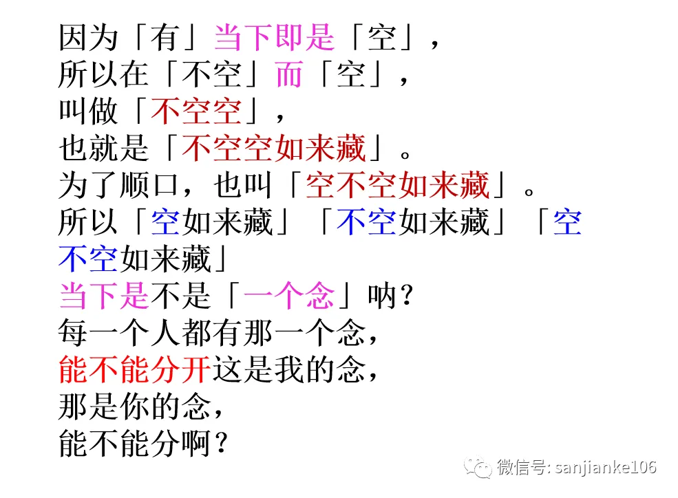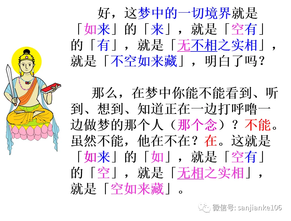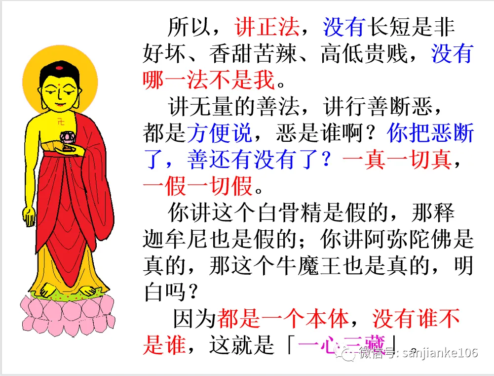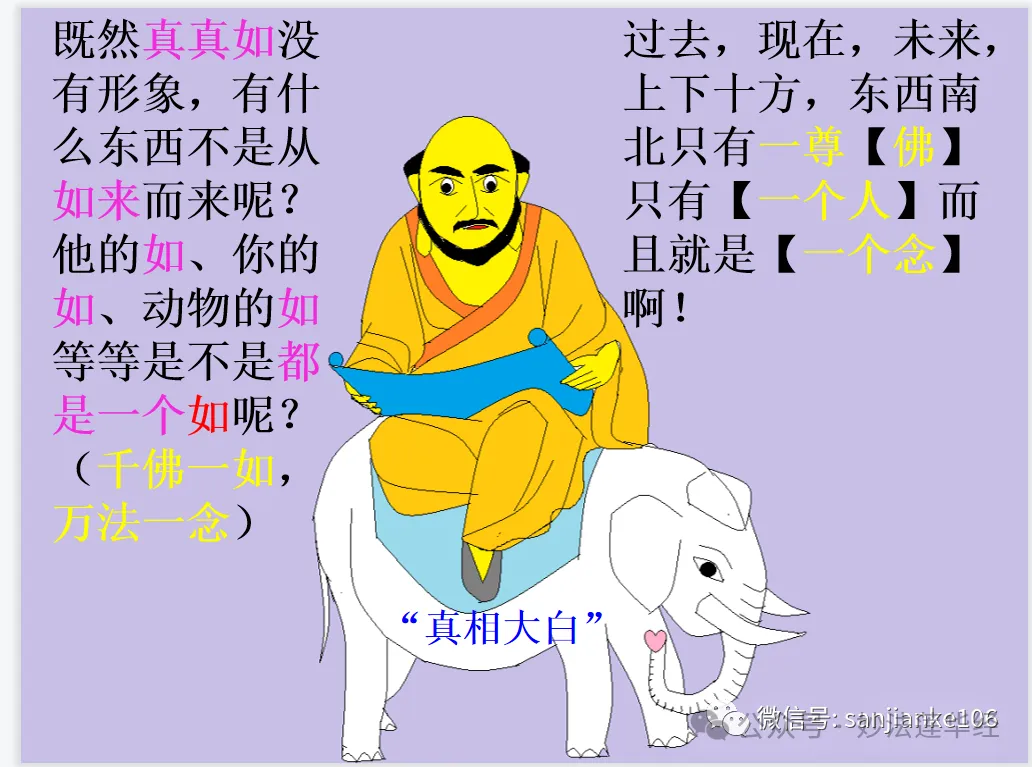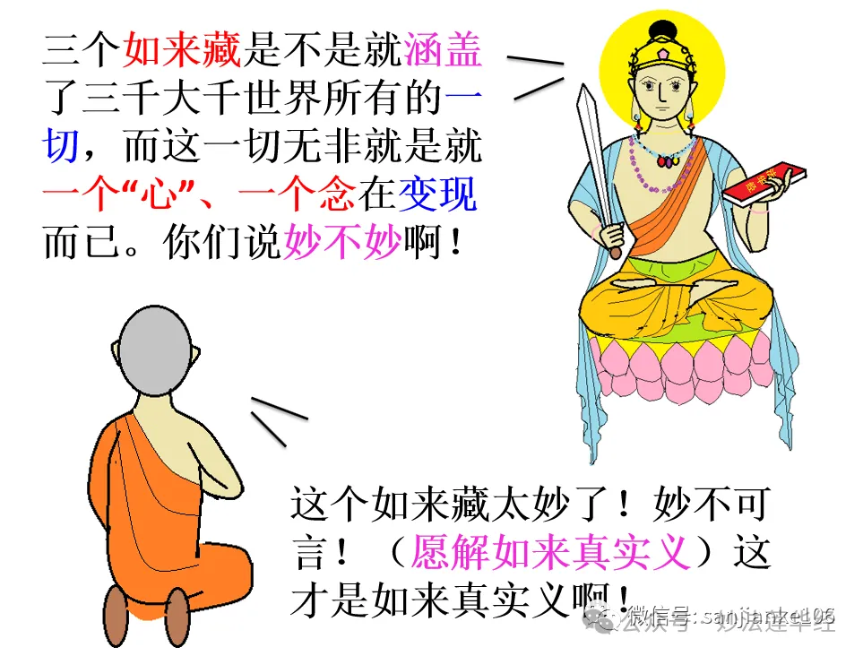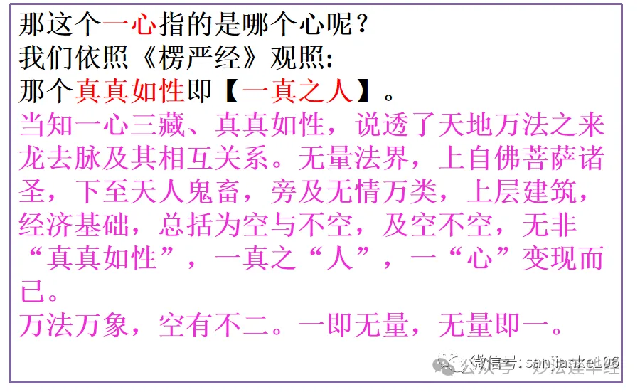 当知一心三藏、真真如性,说透了天地万法之来龙去脉及其相互关系。无量法界,上自佛菩诸圣,下至天人guǐ畜,旁及无情万类,上层建筑,经济基础,总括为空与不空,及空不空,无非“真真如性”,一真之“人”,一“心”变现而已。