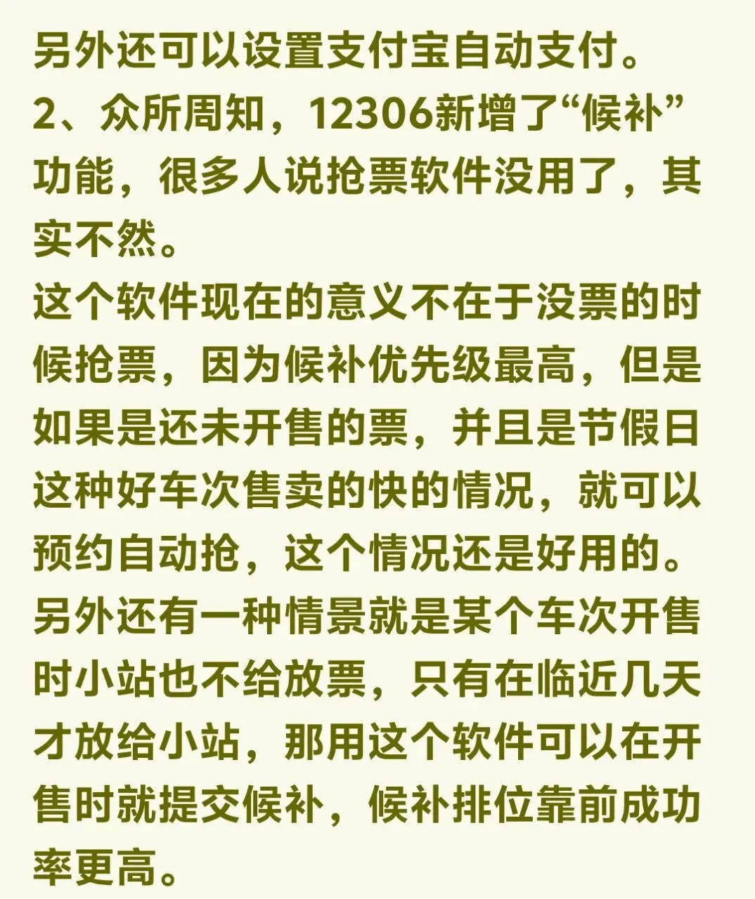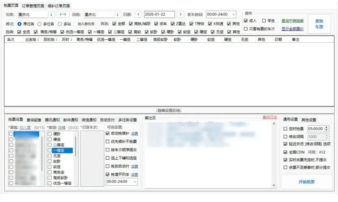 支持多天、多车次、多席别、多乘客、多站查询、多任务等功能,支持各种提醒、选座和选铺、改签刷票、增开监控,自动支付等。