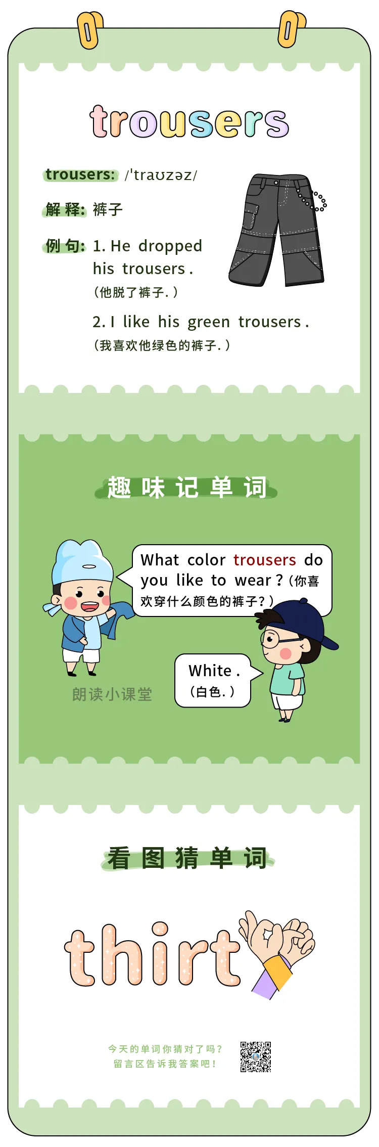 【单词漫画061】 trousers(裤子) ▲点上方绿标,跟着朗读君,看漫画,学单词 作者丨朗读君 来源丨朗读君英语(id:langdujun170) 更多英语工具 点击下方卡片,学习吧! ▼ 点击下方图片 一起学习【更多单词】 ▼ 记得给朗读君点个“在看”哦