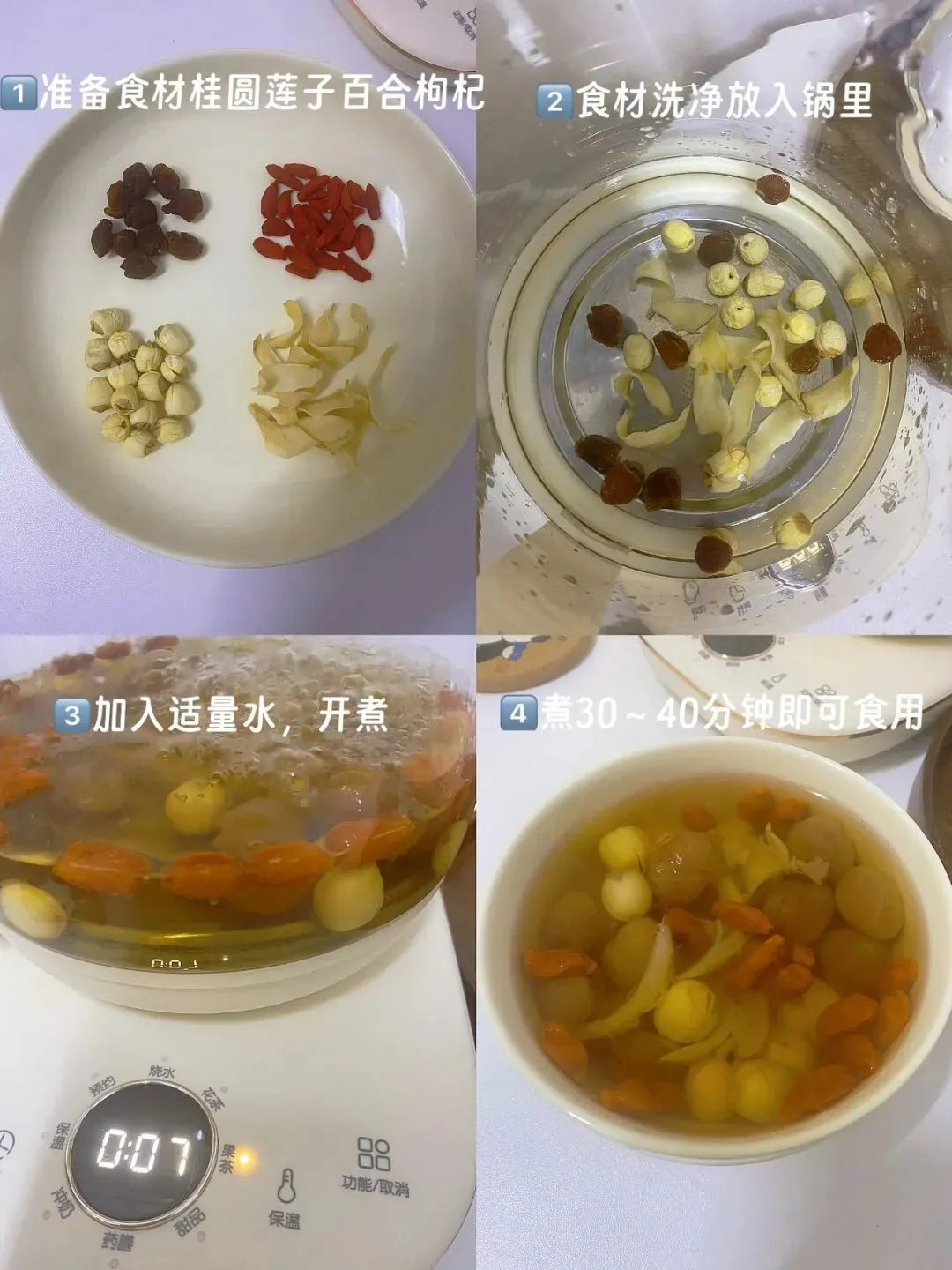 食材:百合20克、莲子20克、桂圆肉10克、枸杞8克