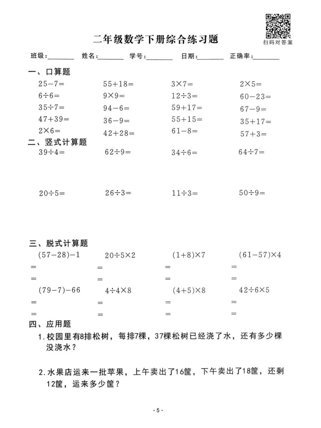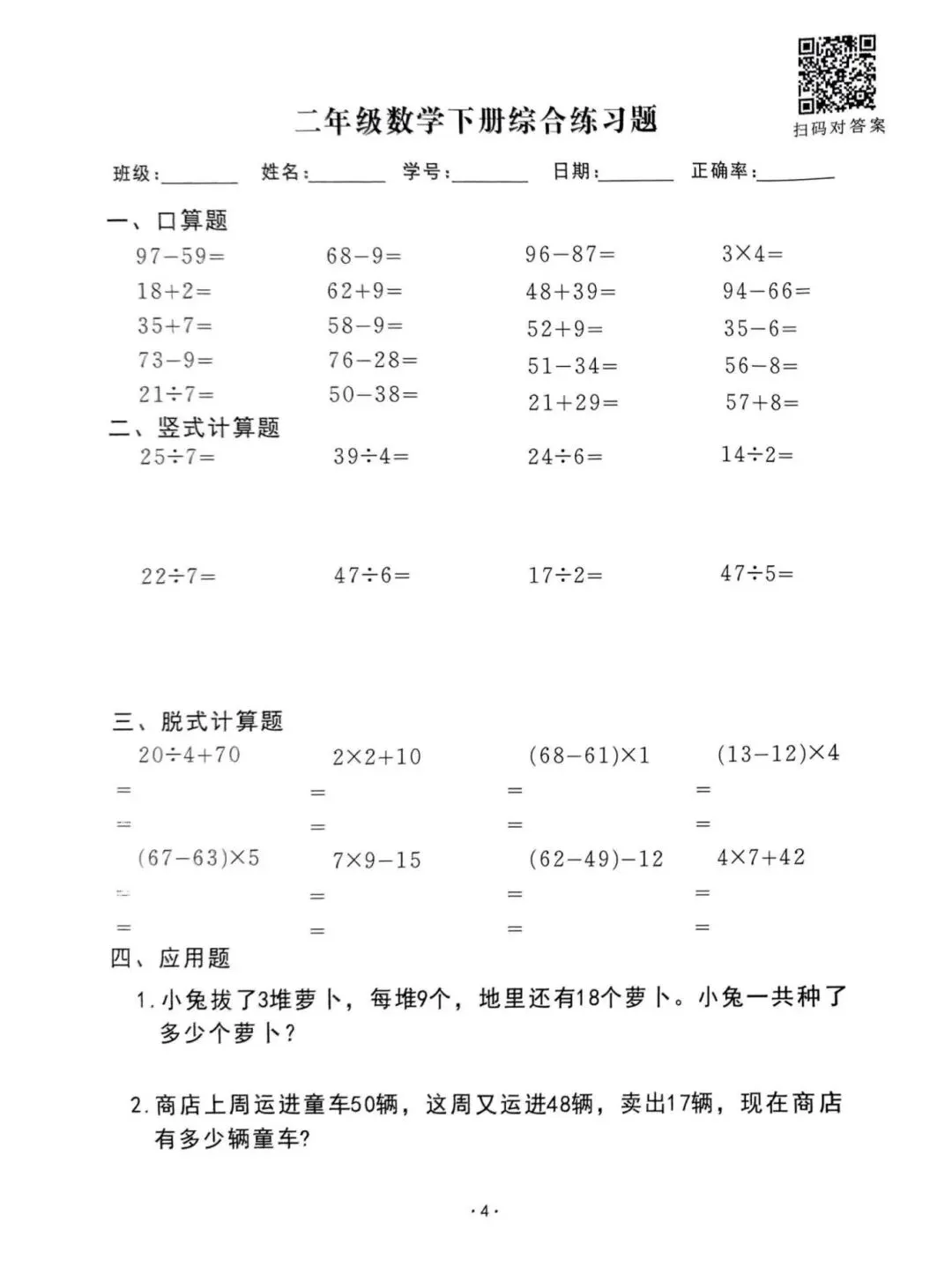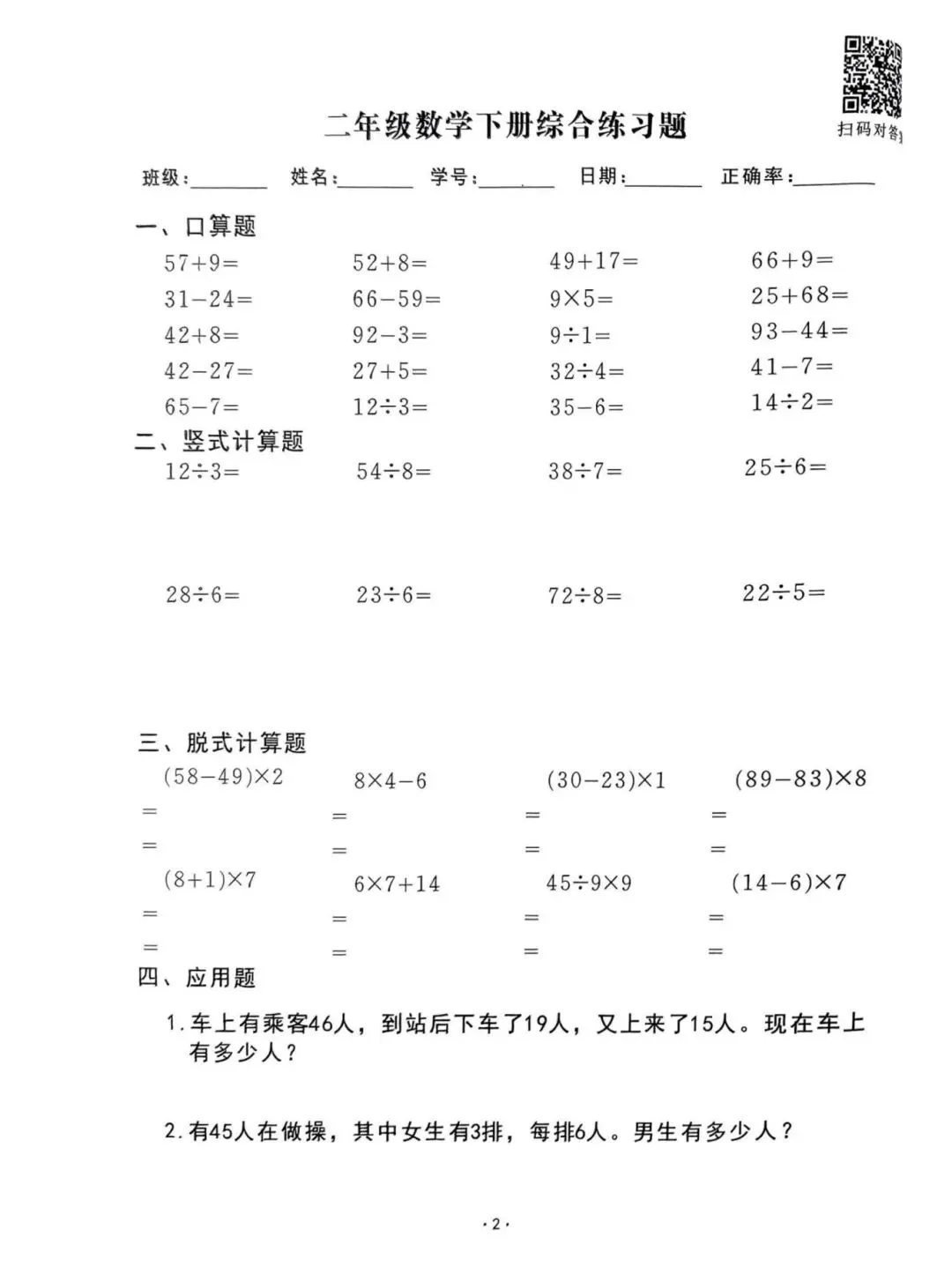 26春通用版二年级下册数学《口算脱式竖式应用题每日一清》,共61页,可打印