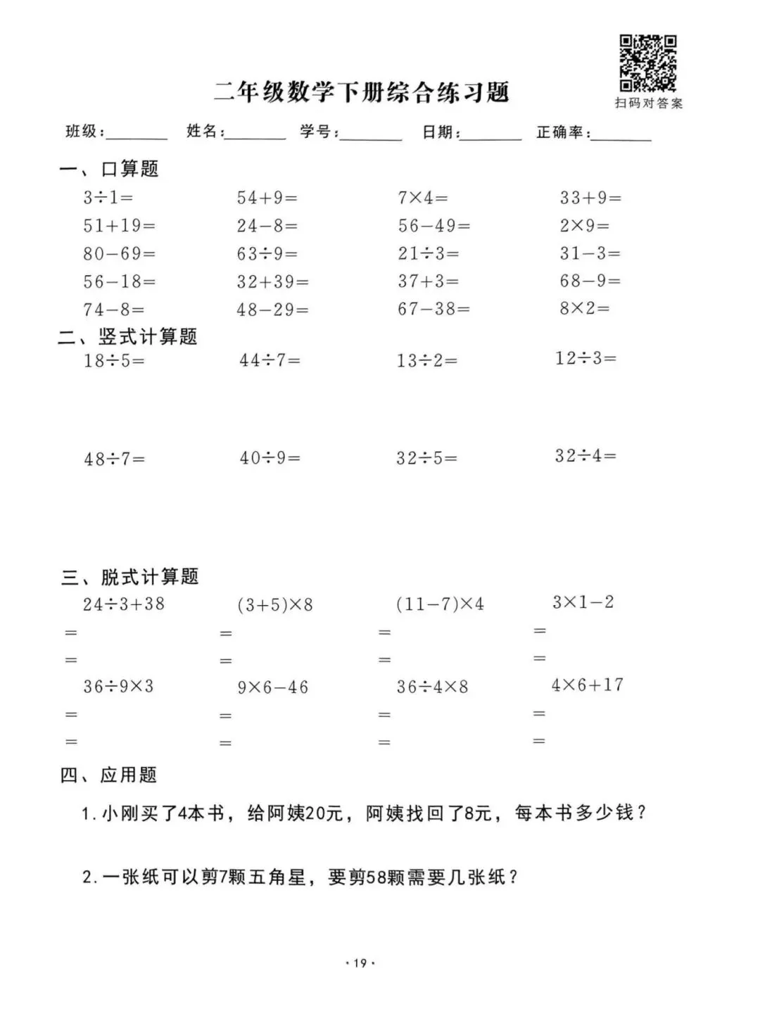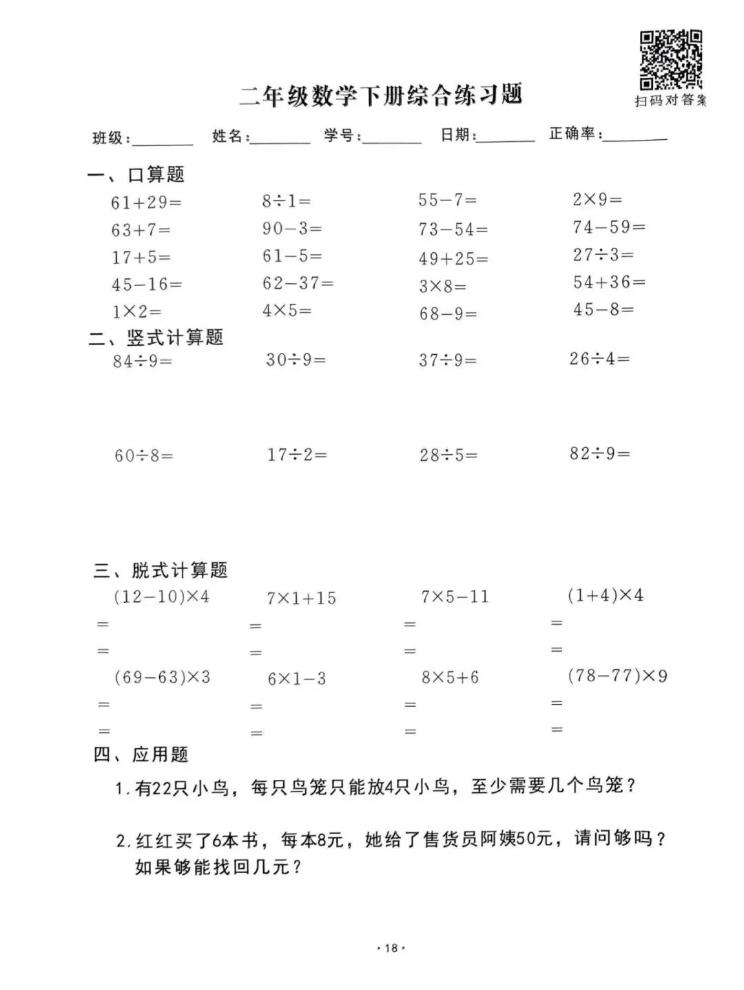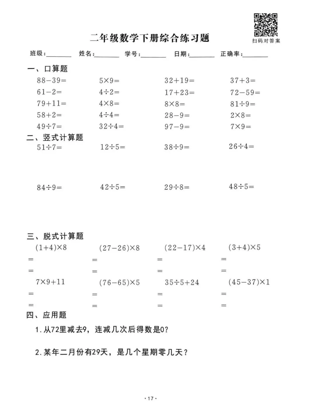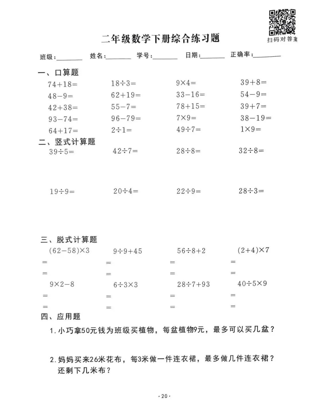 26春通用版二年级下册数学《口算脱式竖式应用题每日一清》,共61页,电子版可打印。帮助孩子查缺补漏、提升学习成绩。有需要的家长快打印给孩子练一练。