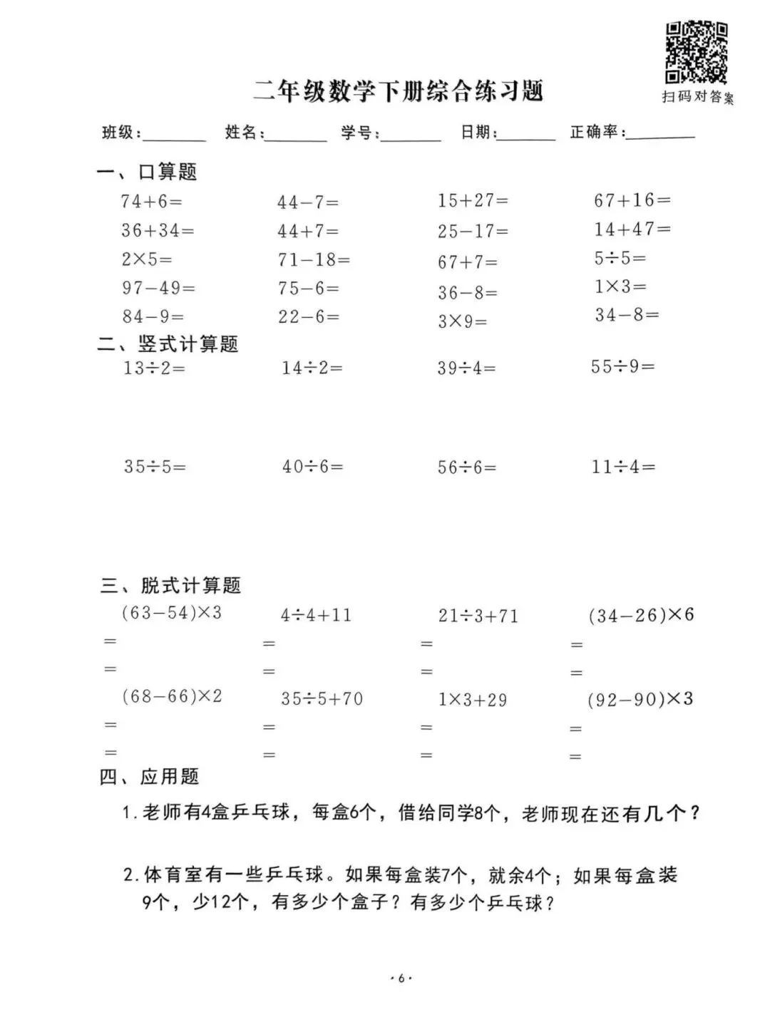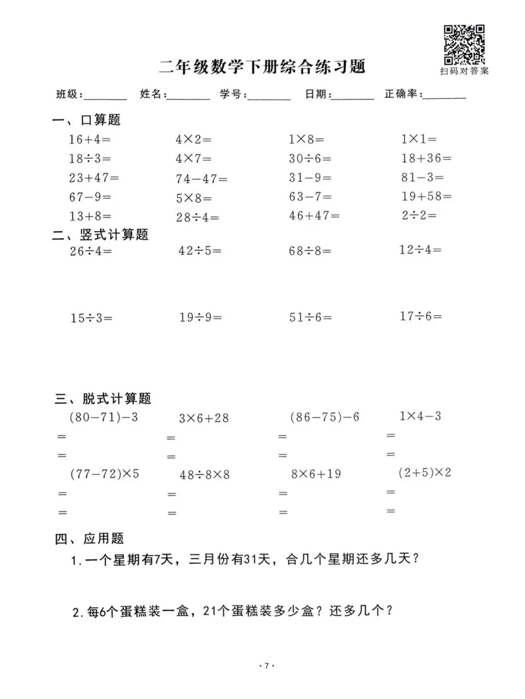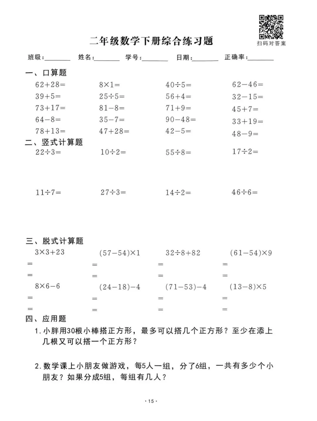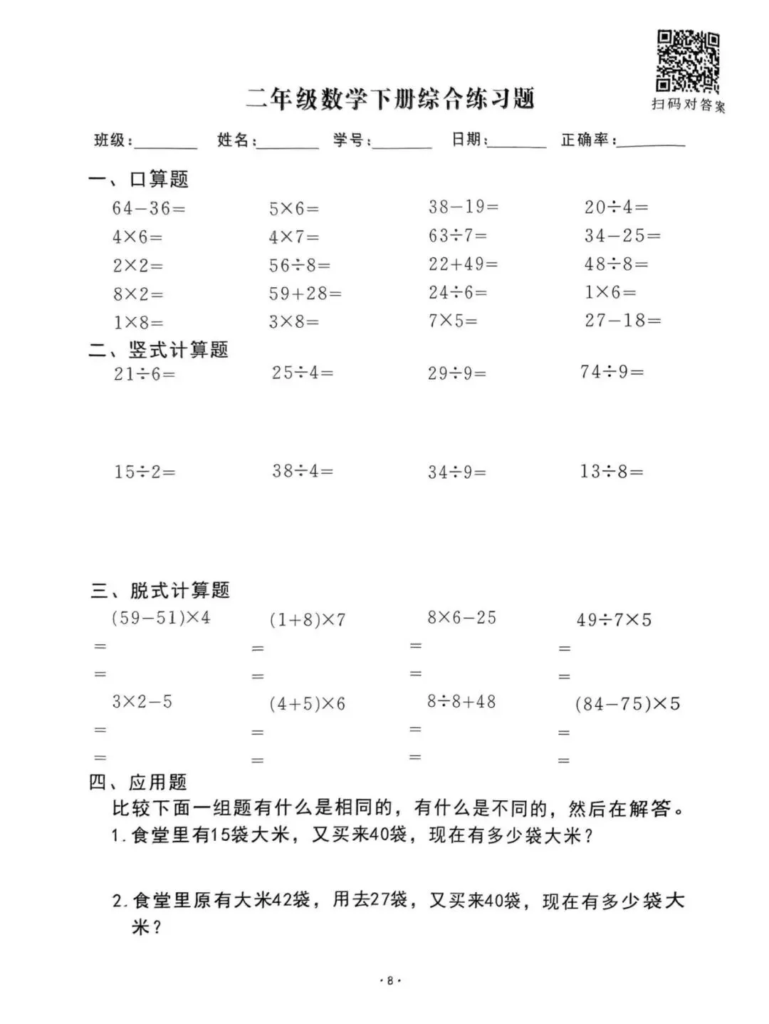 26春通用版二年级下册数学《口算脱式竖式应用题每日一清》,共61页,电子版可打印。帮助孩子查缺补漏、提升学习成绩。有需要的家长快打印给孩子练一练。