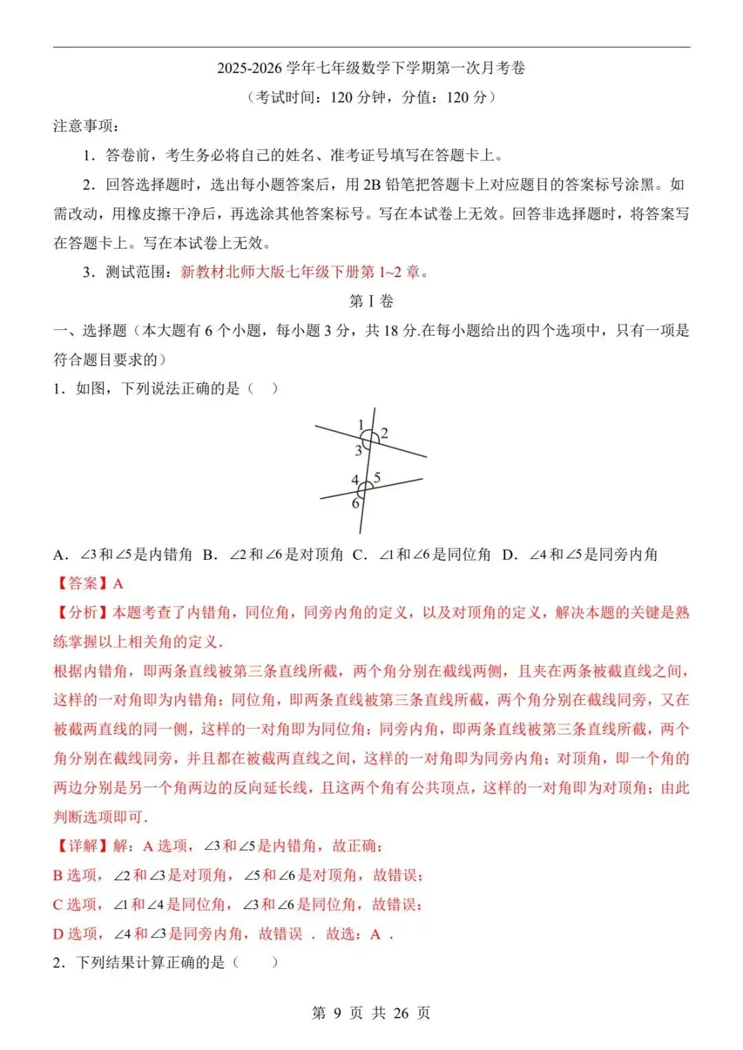 🌸 2026春北师版七年级下册数学《第一次月考测试卷》(含答案),帮助孩子全面检测第1-2章知识掌握情况,查漏补缺,针对性复习,通过实战练习熟悉题型、掌握解题技巧,提升应试能力,助力数学第一次月考取得好成绩!欢迎转发到班级群或朋友圈,帮助更多孩子高效学习~