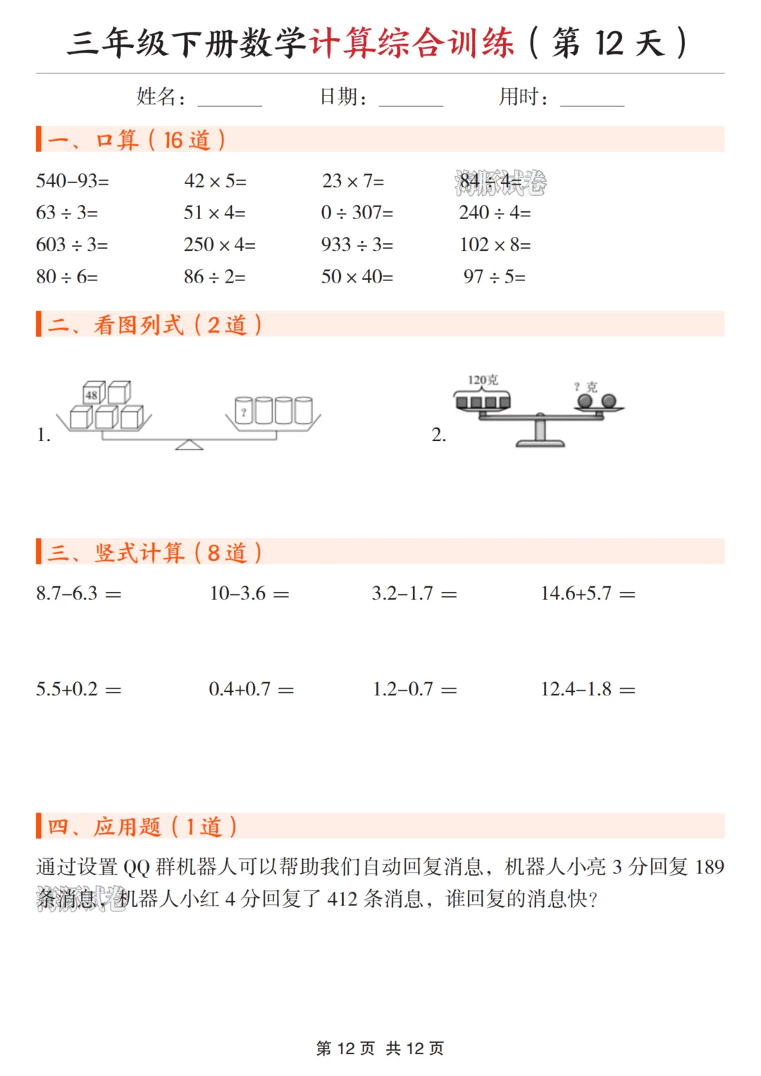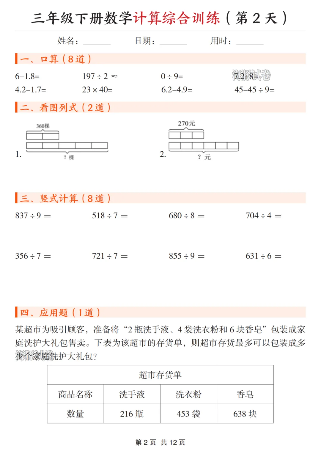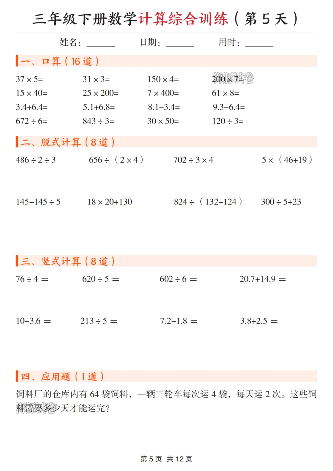 三年级(下)数学计算综合训练 可下载、可打印 三年级(下)数学计算综合训练 电子文档下载,请拉至文末。 免费领取完整电子版: ①:点一点右下角的“赞”和“在看”,感谢! ②:在公众号对话框中回复:0005 说明:本微信公众账号分享的资源均通过网络等公共合法渠道获得,仅供试用!版权属于原出版机构或影像公司,本资源为电子载体,传播分享仅限于家庭使用与交流心得、参考和辅助购买决策,不得以任何理由在商业行为中使用,若喜欢此资源,建议购买实体产品。文章中的视频及图片均来自网络,版权归原作者或原出版社所有。如有侵权,请及时联系删除