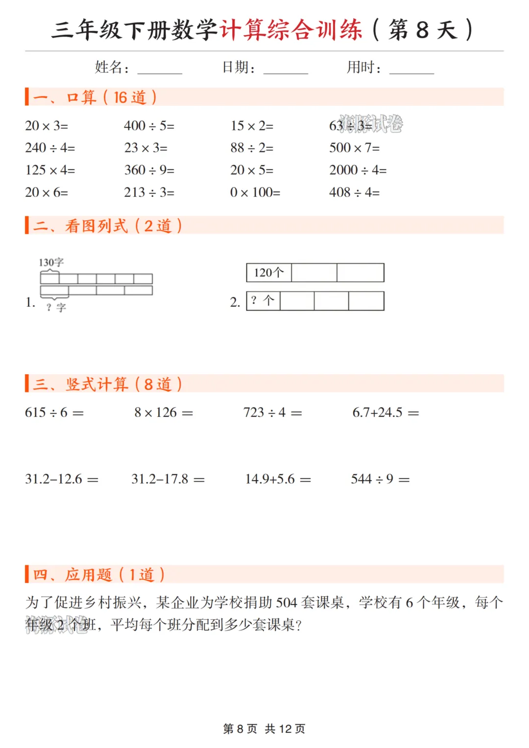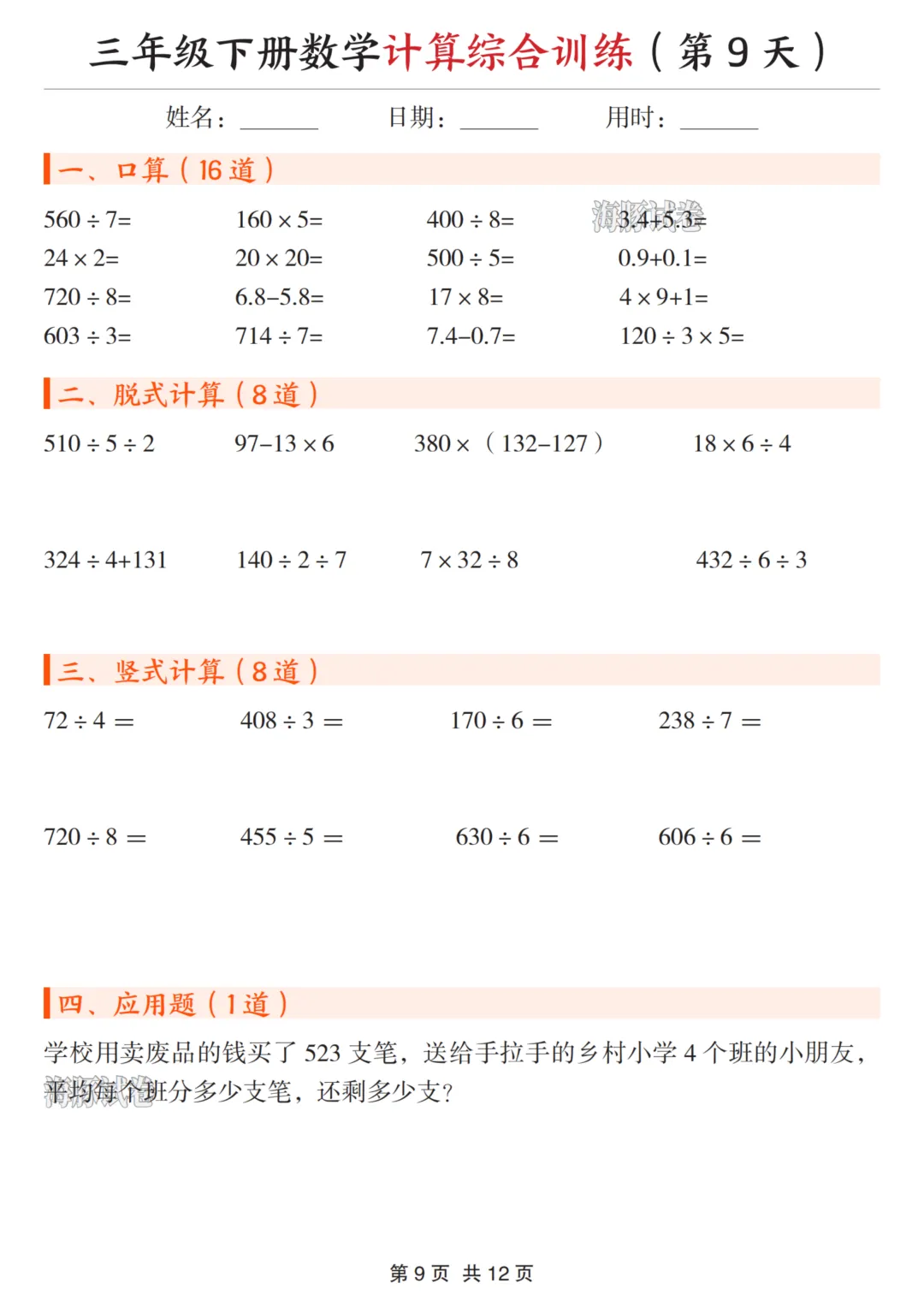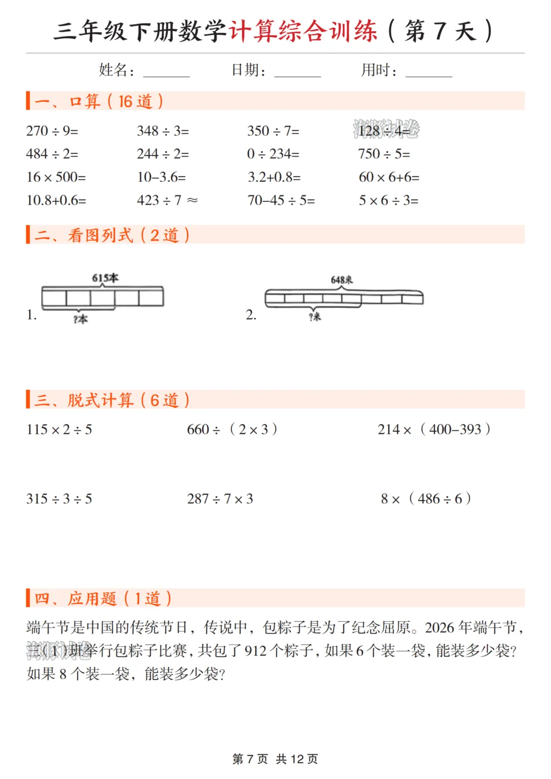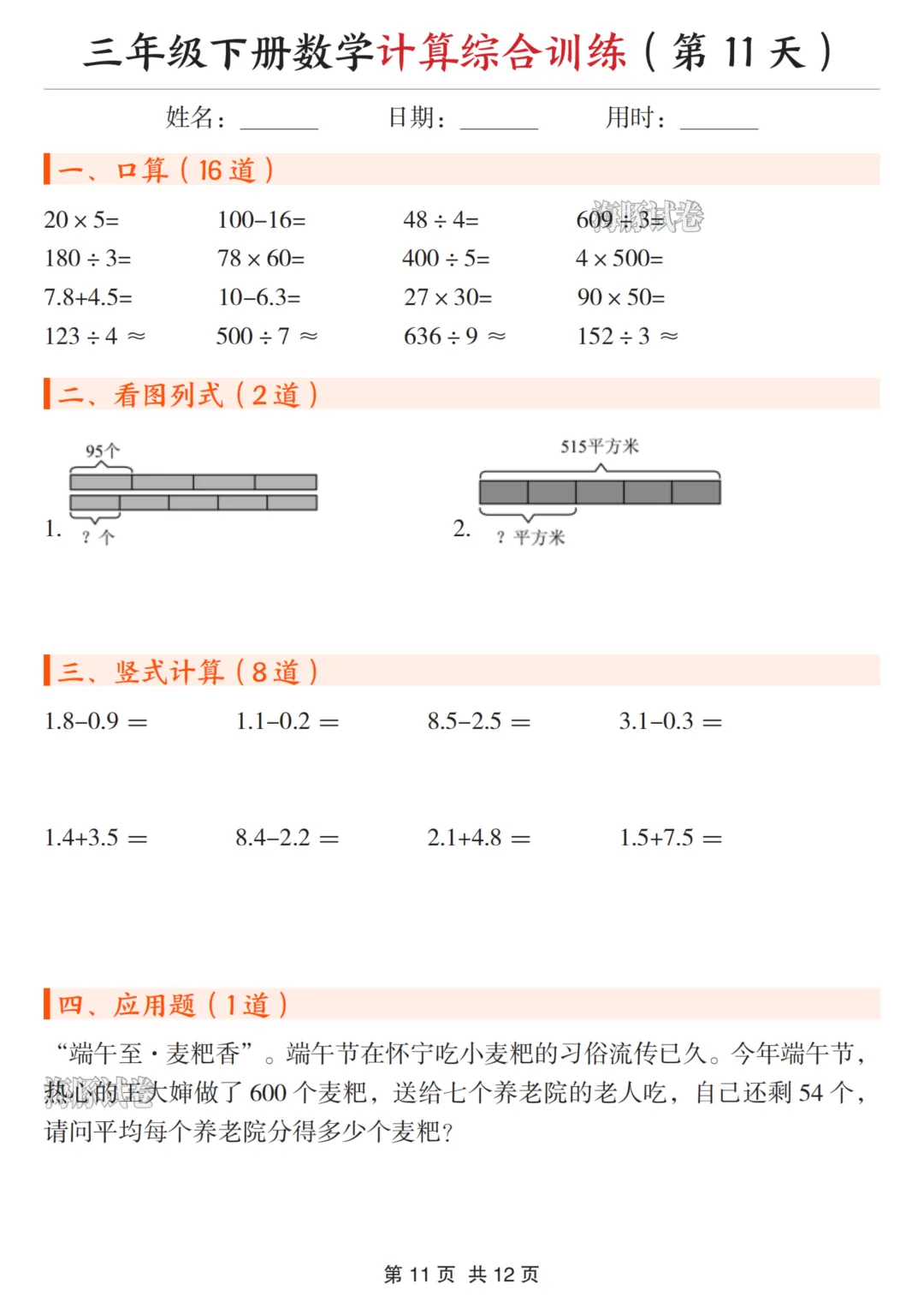 三年级(下)数学计算综合训练 可下载、可打印 三年级(下)数学计算综合训练 电子文档下载,请拉至文末。 免费领取完整电子版: ①:点一点右下角的“赞”和“在看”,感谢! ②:在公众号对话框中回复:0005 说明:本微信公众账号分享的资源均通过网络等公共合法渠道获得,仅供试用!版权属于原出版机构或影像公司,本资源为电子载体,传播分享仅限于家庭使用与交流心得、参考和辅助购买决策,不得以任何理由在商业行为中使用,若喜欢此资源,建议购买实体产品。文章中的视频及图片均来自网络,版权归原作者或原出版社所有。如有侵权,请及时联系删除