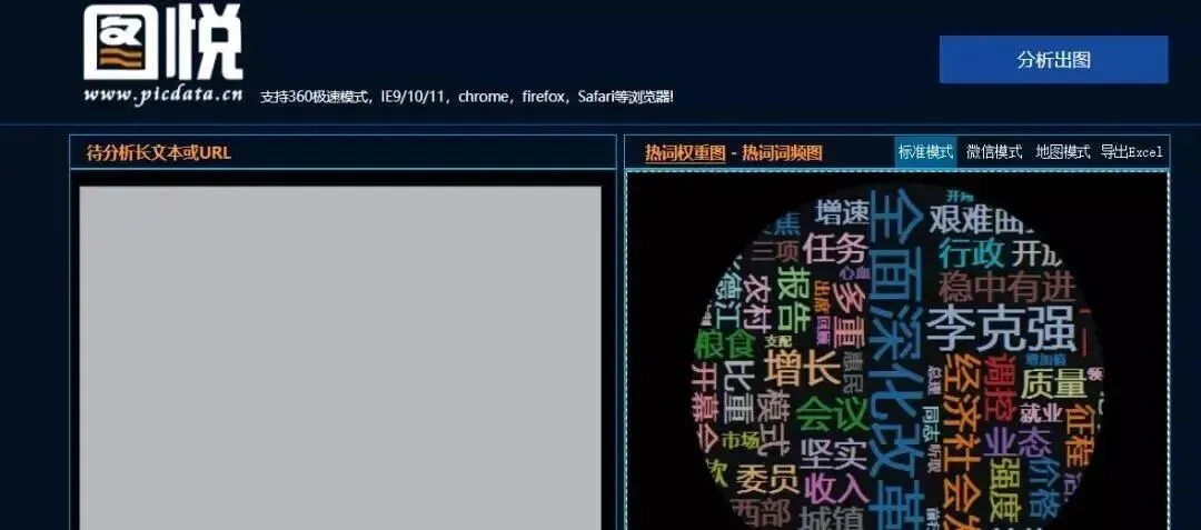 图悦是一款在线的热词分析工具,它可以对于载入文本或指向文本内容的链接进行词频提取和词语(重要性)权重分析,并可以导出成excel格式的文件,便于后期分析和处理。