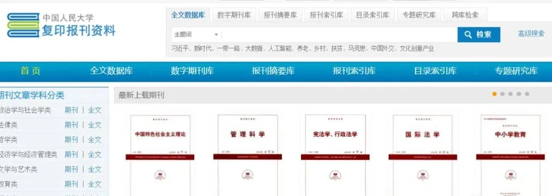 中国人民大学复印报刊资料库,简称“人大复印库”,是人大数媒科技(北京)有限公司以人民大学书报资料中心的复印报刊资料系列数据库为内容基础,辅以检索功能、期刊、论文推荐而成的人文科学、社会科学资料库。