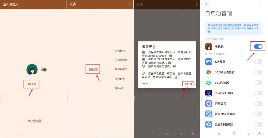 【更多】→【重要提示】→【去设置】→选择李跳跳,将右侧按钮点亮