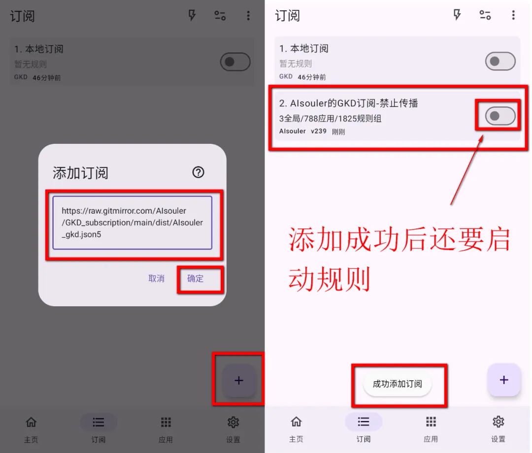 【订阅】→ 点击右下角的+号 → 输入订阅源网址 →【确定】→ 看到成功添加订阅提示就说明添加成功了