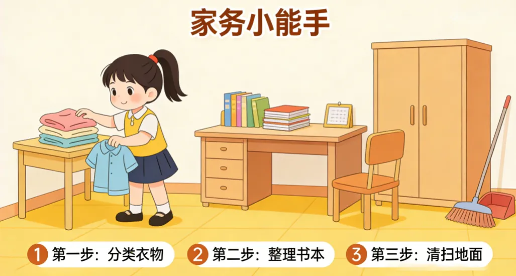 今天我们把难度稍微提升一点,不再局限于简单句,而是加入完整表达、原因说明、建议与反馈,让孩子逐渐学会“说完整话”。主题是家庭家务 + 整理房间 + 责任意识培养。这些内容贴近日常生活,也很适合培养孩子的习惯与表达能力。