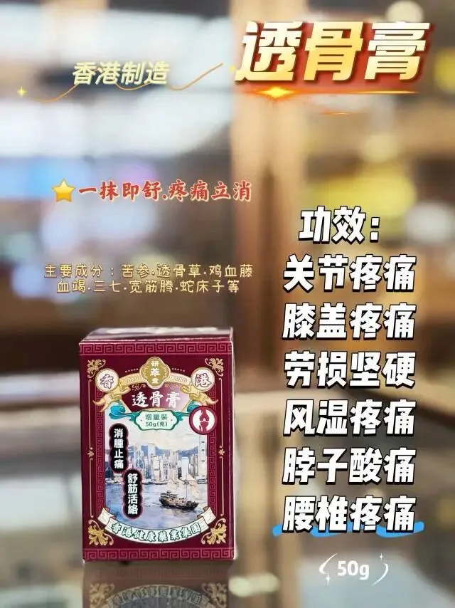 香港透骨膏 全新增量装50g【适用人群】适用于骨骼关节受伤、关节活动不畅或疼痛、新旧关节伤患、关节劳损僵硬、膝盖脚踝等关节问题!