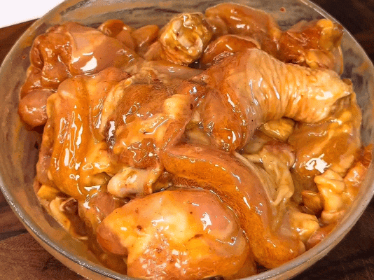 2. 鸡腿肉切成大块,加入1小勺白胡椒粉、2勺生抽、1勺蚝油、1勺淀粉,抓匀后淋少许食用油,腌制15分钟(锁水更嫩,不柴不腥);