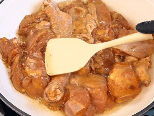 6. 倒入炒好的鸡腿肉,加1勺料酒、1小勺老抽、少许冰糖,翻炒均匀,让每块鸡肉都裹上酱汁;