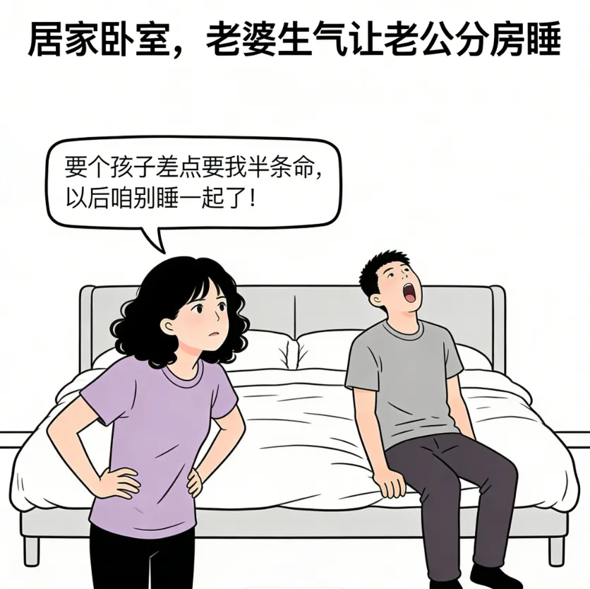 趣味漫画:老婆说:要个孩子差点要我半条命,以后咱别睡一起了,老公:保命要紧,我去隔壁睡