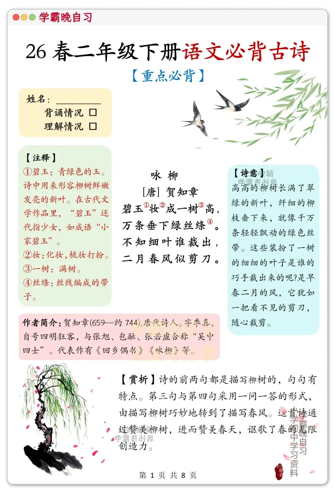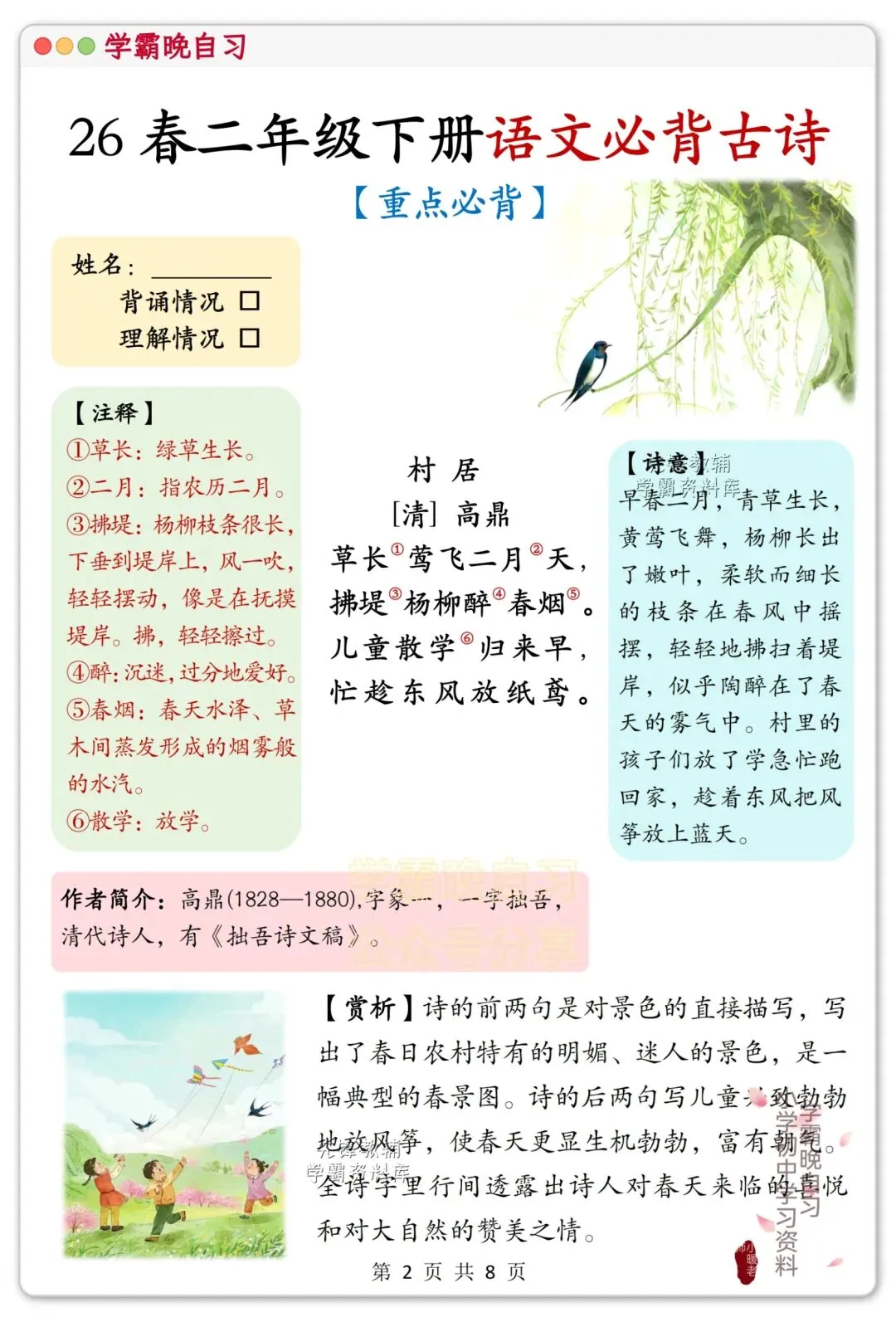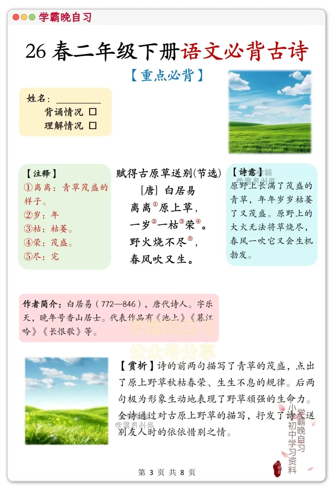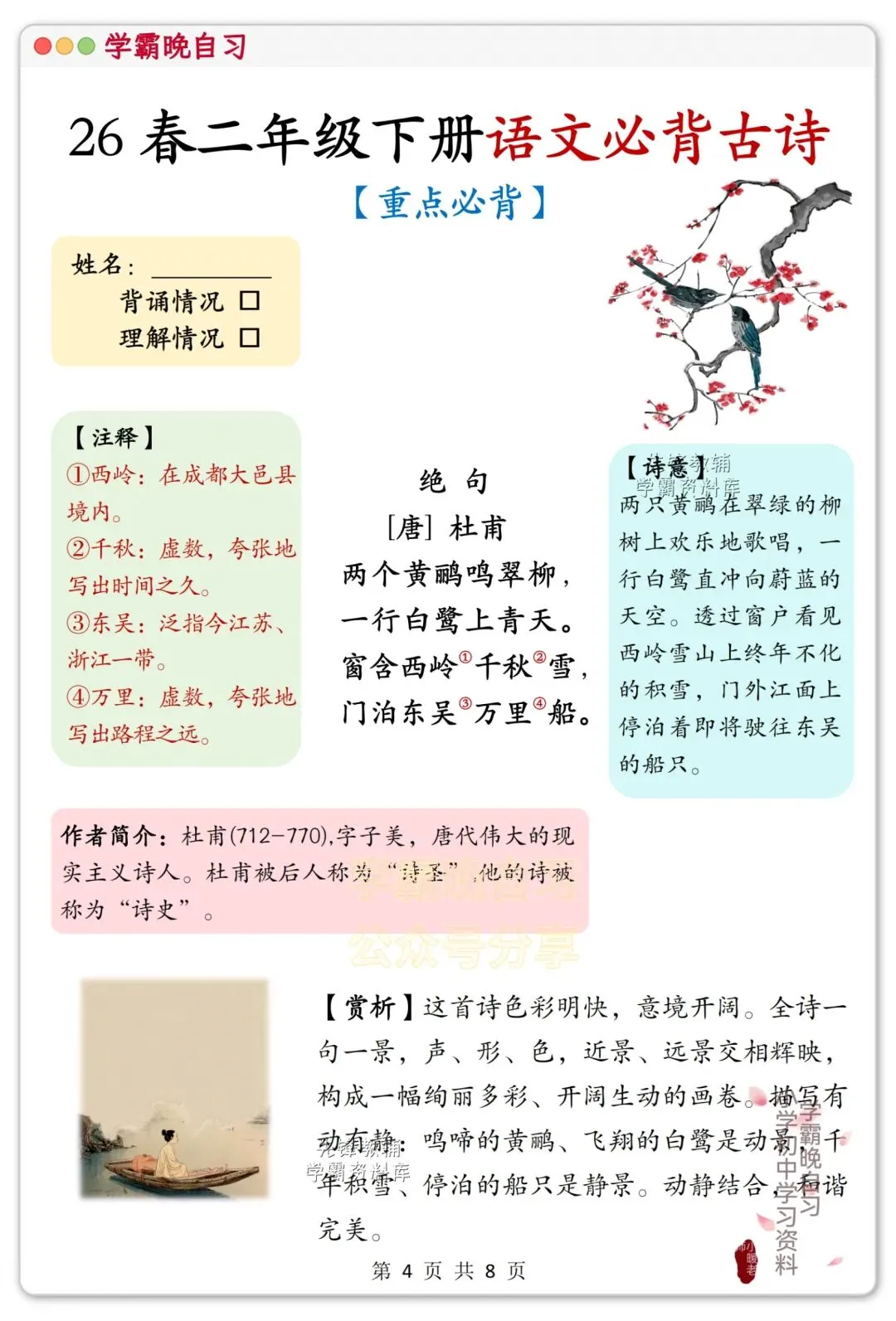 各位家长好!二年级孩子该进阶积累古诗文了,这套课内必背古诗,精选课本重点篇目,每首都配了详细注释、诗意解读和赏析,贴合课堂考点,不光能帮孩子搞定背诵默写,还能慢慢培养诗词理解能力。资料打印方便,日常晨读、课后巩固都能用,是孩子积累古诗的好帮手!