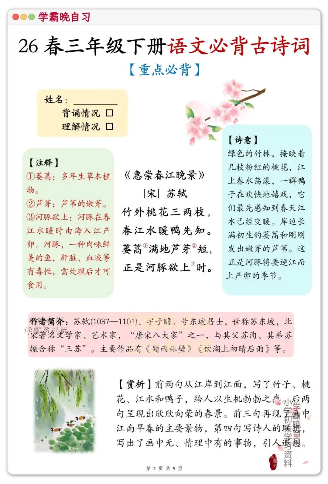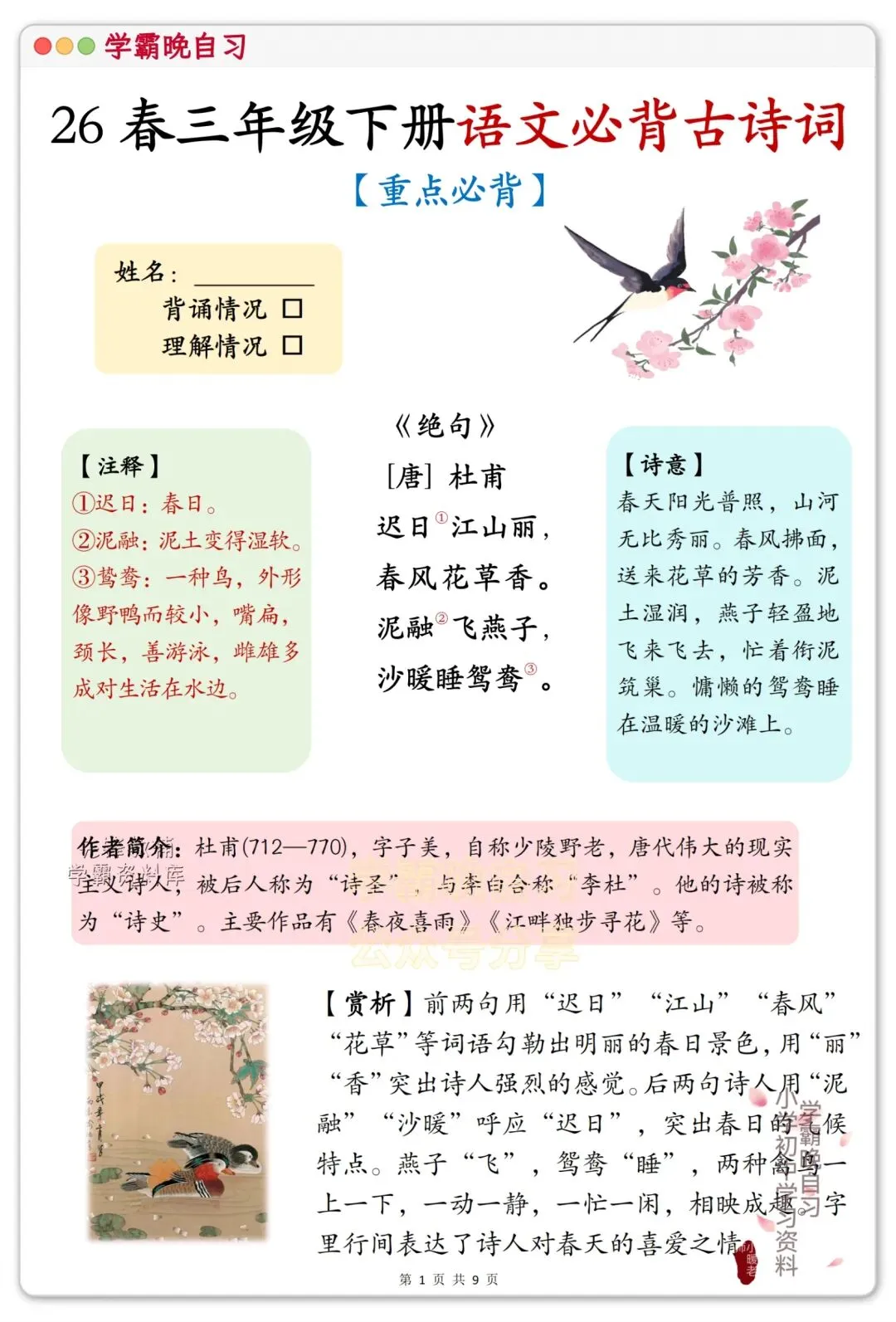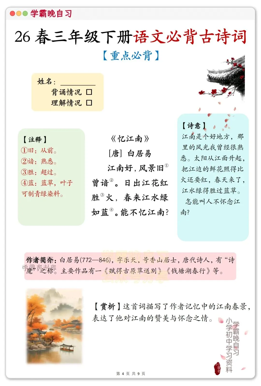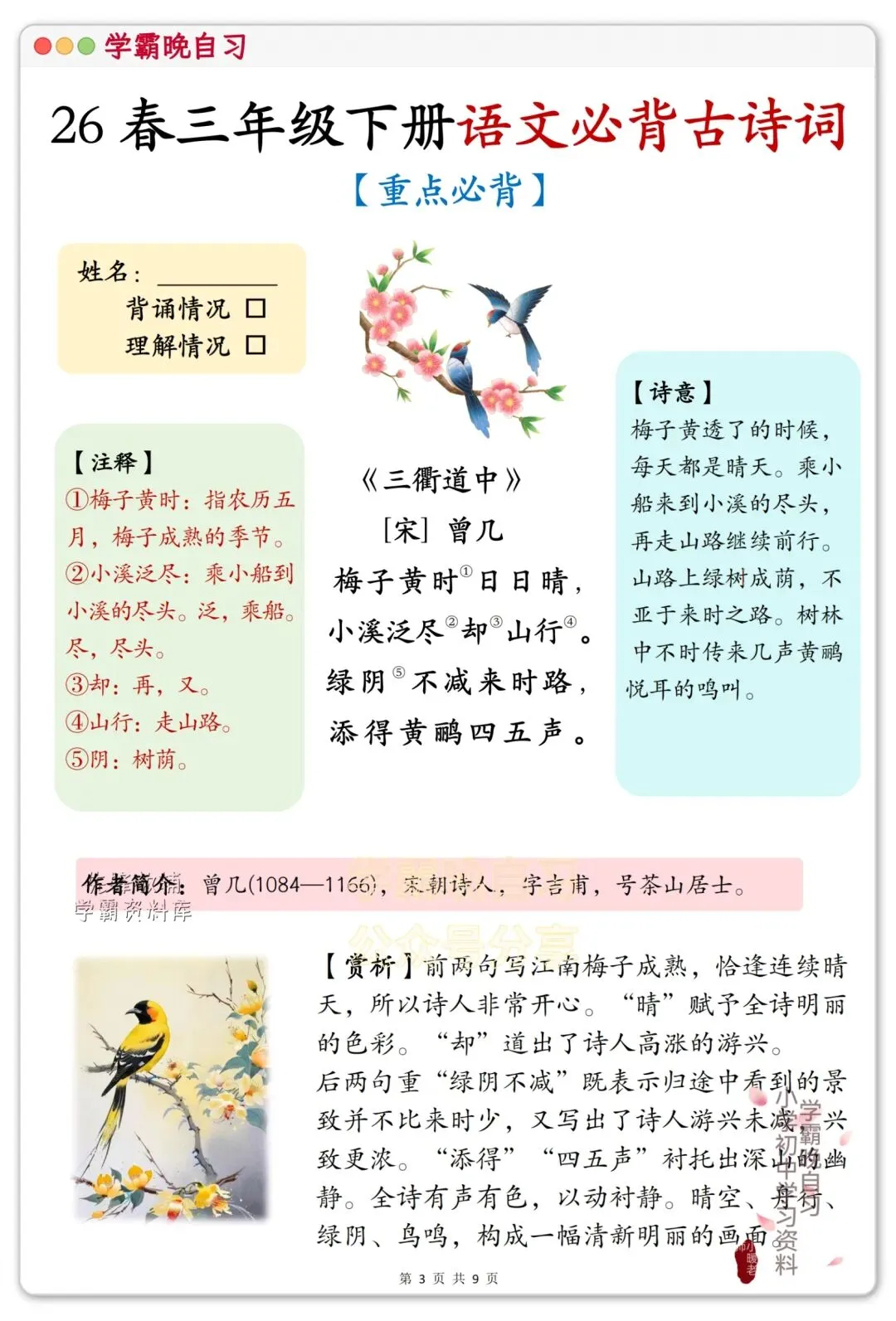 各位家长好!三年级古诗文学习,更注重理解和赏析,这套课内必背古诗词,收录课本核心篇目,每首都有精准注释、通俗诗意和深度赏析,贴合课内考法,背诵、默写、理解考点全覆盖。排版清晰易打印,帮孩子系统积累经典诗词,吃透诗词内涵,慢慢提升古诗文综合素养,轻松应对课堂考查!