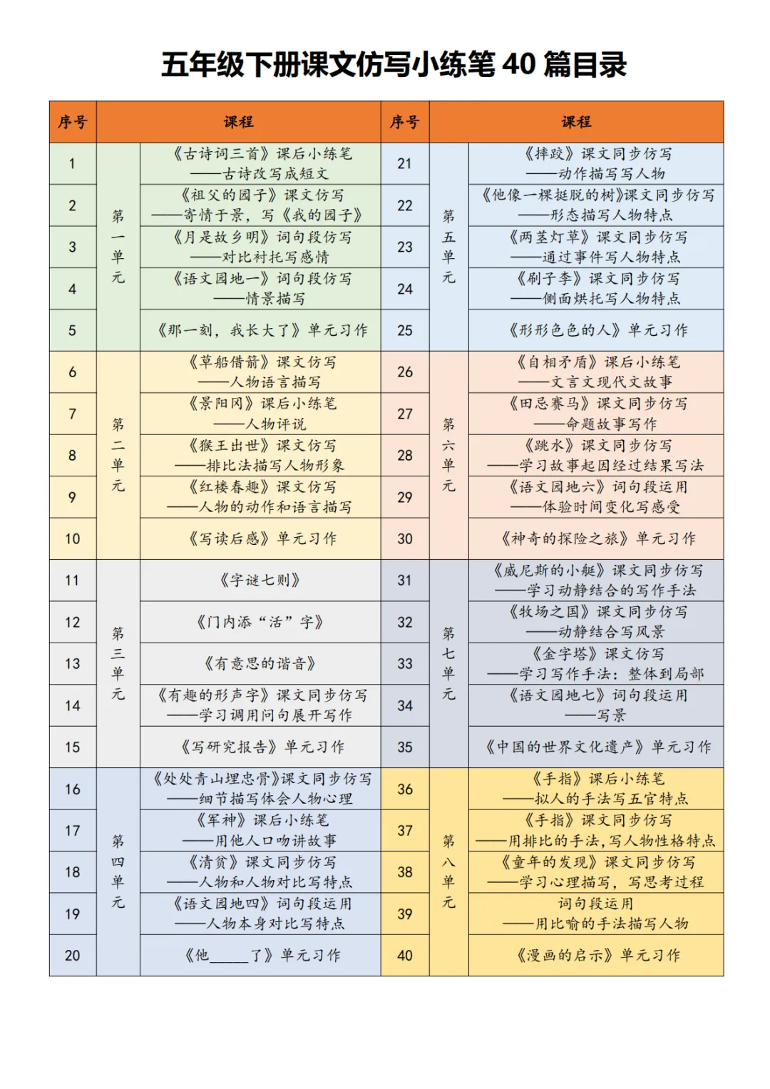 本期给大家整理的是26年五年级语文下册【课文仿写小练笔】,电子版可打印,需要的家长可以打印给孩子练习巩固。