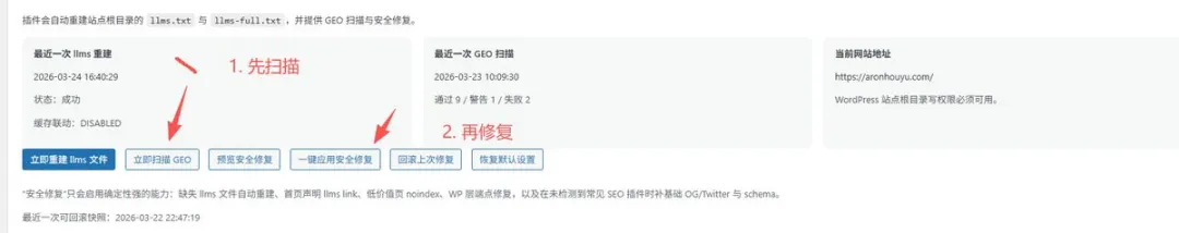 - 自动安全修复:扫描后根据问题自动执行(Ilms缺失重建、LLMSLink注入、低价值页noindex、WP层端点修复)