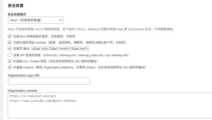 - 一键安全修复:启用低价值Ilms过滤、低价值页noindex、基础OG/Twitter与schema补全(未检测到常见SEO插件时)