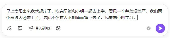 我们可以先输入一段简短文字,把核心内容简单表述出来,紧接着输入指令:润色,扩写成 500 字小学生作文。