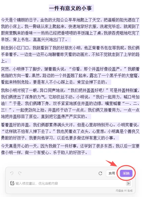 生成内容的下方会出现 【弃用】 与 【采纳】 两个选项,大家可以先预览全文,内容合适就直接采纳,不满意则可以选择【弃用】。