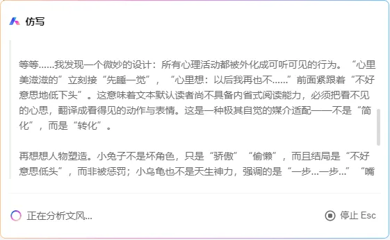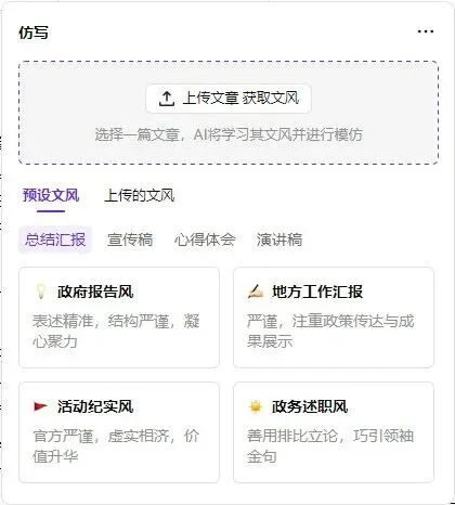 仿写仿写功能同样具备较高实用性。大家可以先上传一篇参考文档,让 AI 学习文档的写作风格,再将需要转换风格的内容交给 AI,AI 就可以快速按照目标风格完成创作。