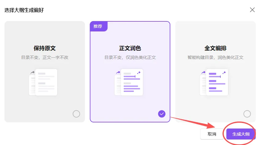 文档生成PPT我们继续使用刚才排版完成的文章,点击文档生成 PPT按钮。整个流程分为三步:生成大纲→选择模板→确认生成。