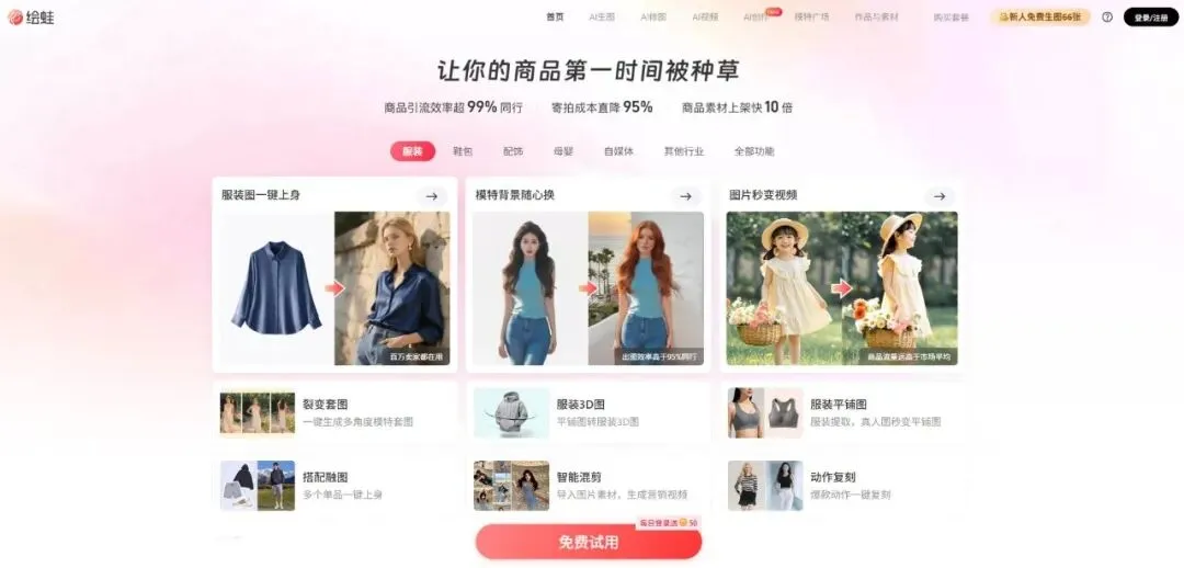 平台的功能围绕“服装”这一核心品类展开,覆盖了从生成、编辑到视频的完整链条: