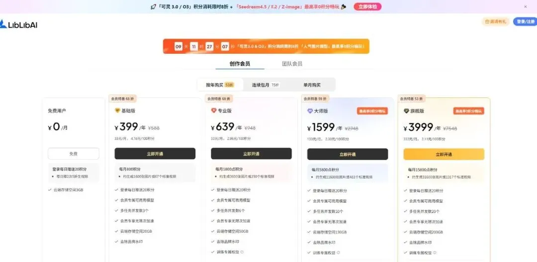 官网明确“登陆即送130堆豆”,并提供免费体验会员模式,强调“生图免费无压力”和“生图版权零压力”,解决了创作者对试用成本和图片版权的核心顾虑。