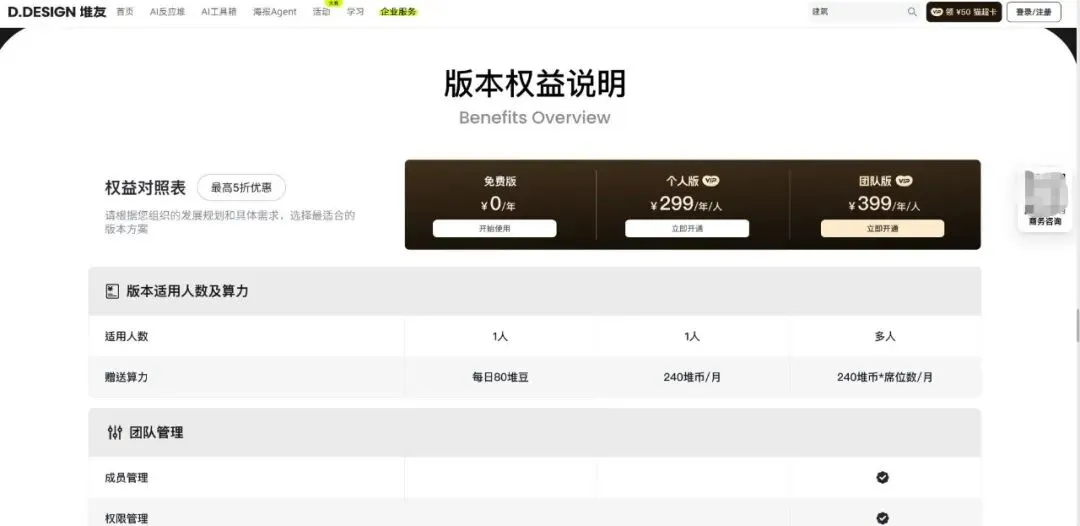堆友的定位非常清晰:Alibaba Design旗下的设计服务平台。它不只是一个AI生图工具,而是一个集AI创作、素材模板、灵感社区于一体的综合性平台。平台通过提供大量“零门槛”的模板和“一键同款”功能,大大降低了设计门槛,让没有专业软件技能的用户也能快速产出海报、头像、电商图等。