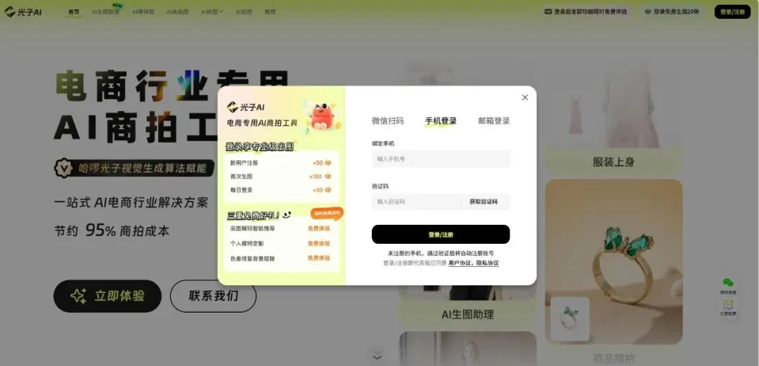 Photonic AI Club 的定位非常精准:为电商卖家提供从模特展示、商品图生成到后期修图的全链路AI视觉解决方案。其官网明确宣称能“节约95%商拍成本”,核心卖点“服装一键上身”直击服装电商的痛点——无需真人模特和实景拍摄,仅用服装平铺图即可生成上身效果图。