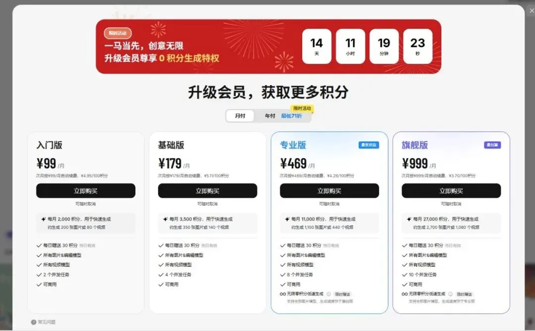 :¥58/月,送700金币,可生成350张图;¥128/3个月,送1800金币,可生成900张图;¥258/6个月,送3800金币,可生成1900张图。