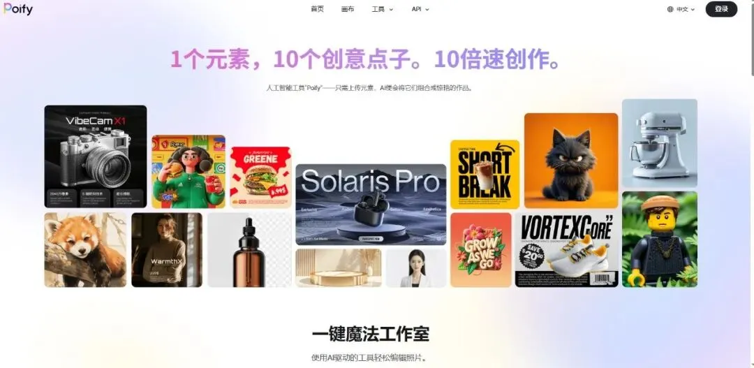 虽然官网未列出详细工具菜单,但从其口号“让每个人都能轻松创作出专业级图片和视频”和模板类型可以推断,其底层能力包括: